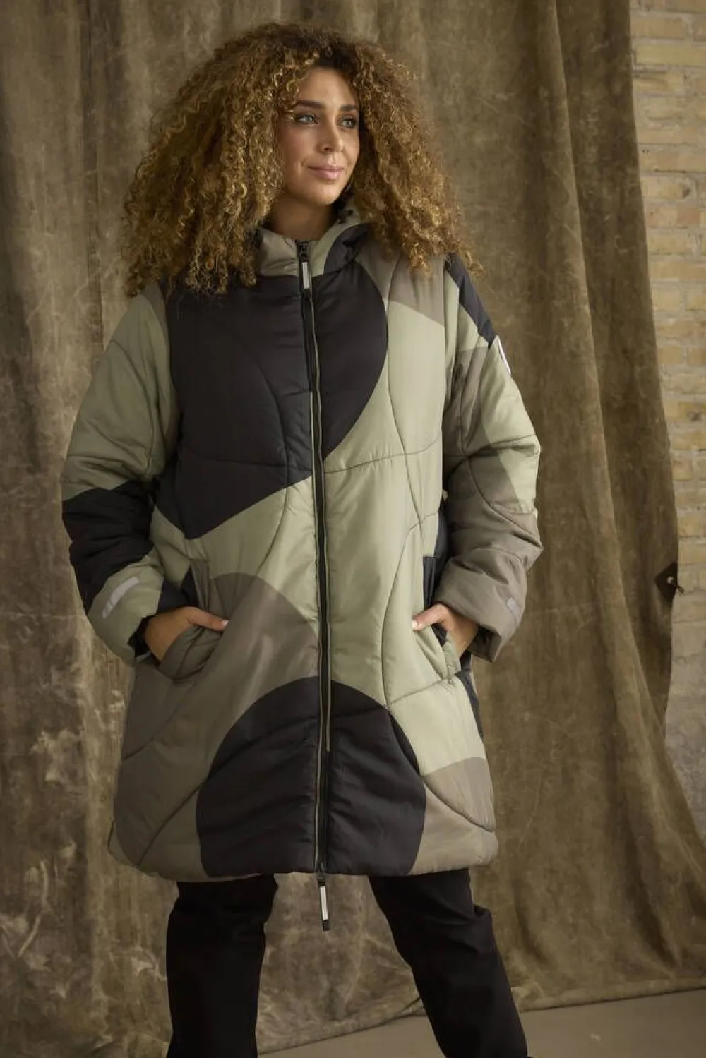 Persoonallinen toppatakki kaarevilla tikkauksilla ja graafisella väriprintillä. Edessä on kaksisuuntainen vetoketjuki…