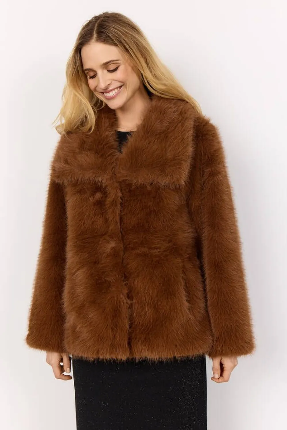 Huipputrendikäs tekoturkistakki massiivisilla kauluksilla. Edessä on taskus ja näppärä hakaskiinnitys.Lisää tieto…