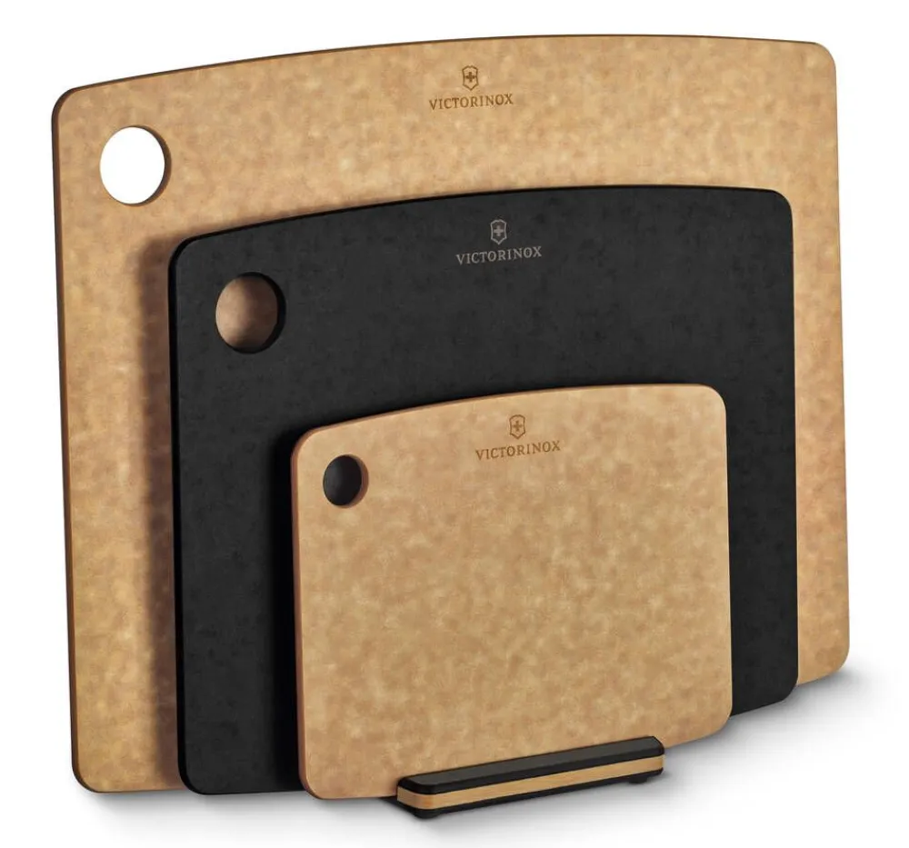 Victorinoxin leikkuulautateline on valmistettu astianpesukoneen kestävästä, ympäristöystävällisestä paperikomposiittimateriaalista. Näppäränkokoisessa, yksinkertaisessa telineessä on tilaa kolmelle leikkuulaudalle. Sopivan leikkuulaudan enimmäispaksuus on 6 mm, joten se sopii hyvin esim. Victorinoxin leikkuulaudoille. Telineen pohjassa olevat liukuesteet pitävät sen paikallaan keittiön tasolla. Materiaali koostuu paperiarkeista, jotka prässätään yhteen tasaisen lämmön ja paineen avulla. Lopputuloksena on vankka, tasapainoinen ja kestävä materiaali. Tuotteet valmistetaan Epicureanin tehtaalla Wisconsinissa. Kaikki tuotantoprosessin aikana syntyvä jäte ja ylijäämämateriaali pyritään minimoimaan, käyttämään uudelleen tai kierrättämään aina kun mahdollista. Myös lämpö otetaan talteen ja käytetään varastotilojen lämmittämiseen talvella. Materiaalilla on mm. GREENGUARD- ja FSC® -sertifikaatit.