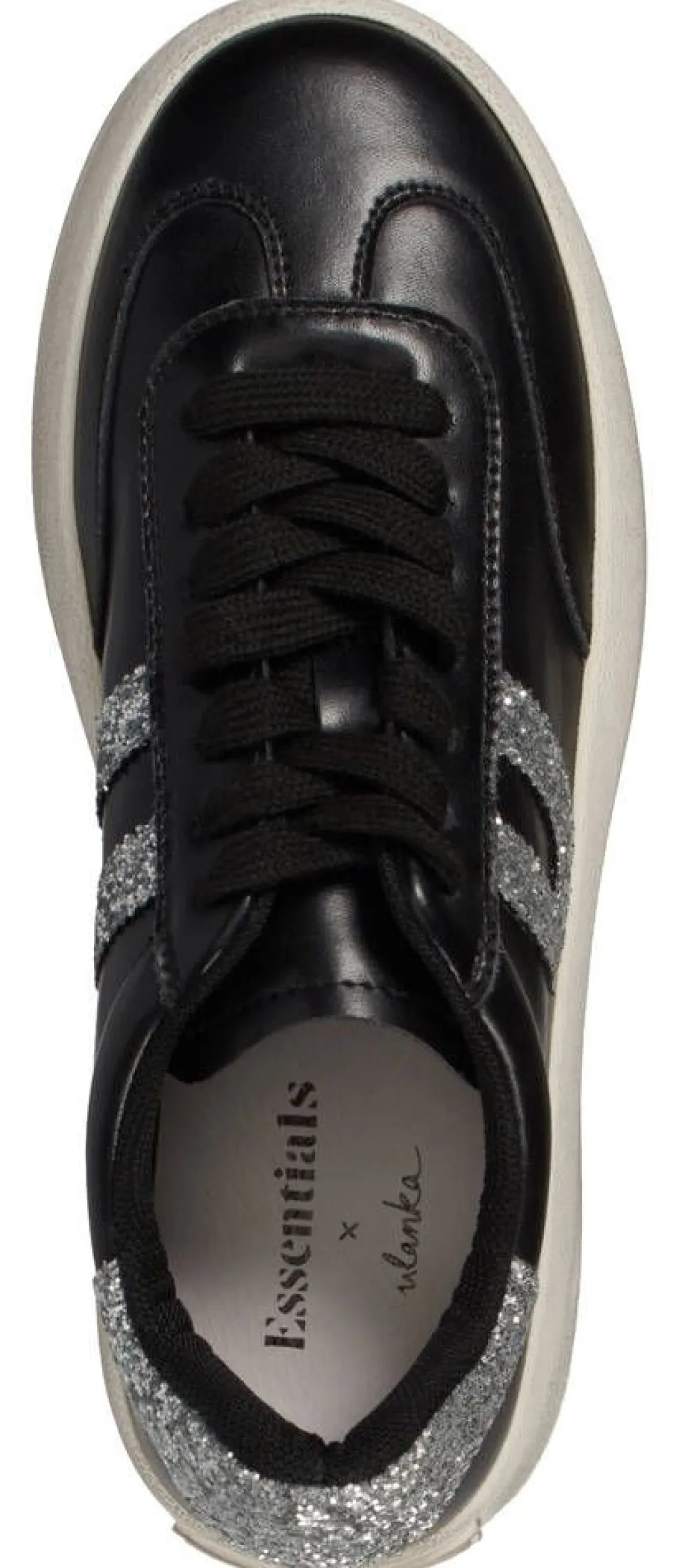 Pintanahkaiset tennarit pehmustetulla sisäpohjalla ja glittertehosteilla. Kengissä on nauhakiinnitys sekä paksu ulkop…