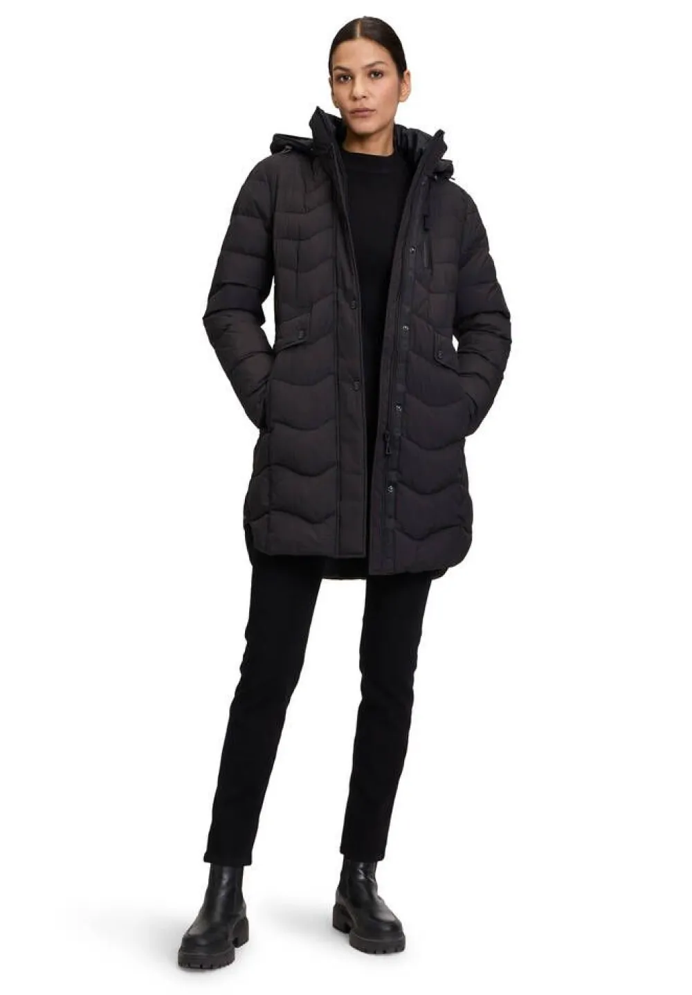Aaltokuvioitu toppatakki irrotettavalla hupulla. Mustassa takissa on vetoketjullinen rintatasku ja läpälliset etutasku…