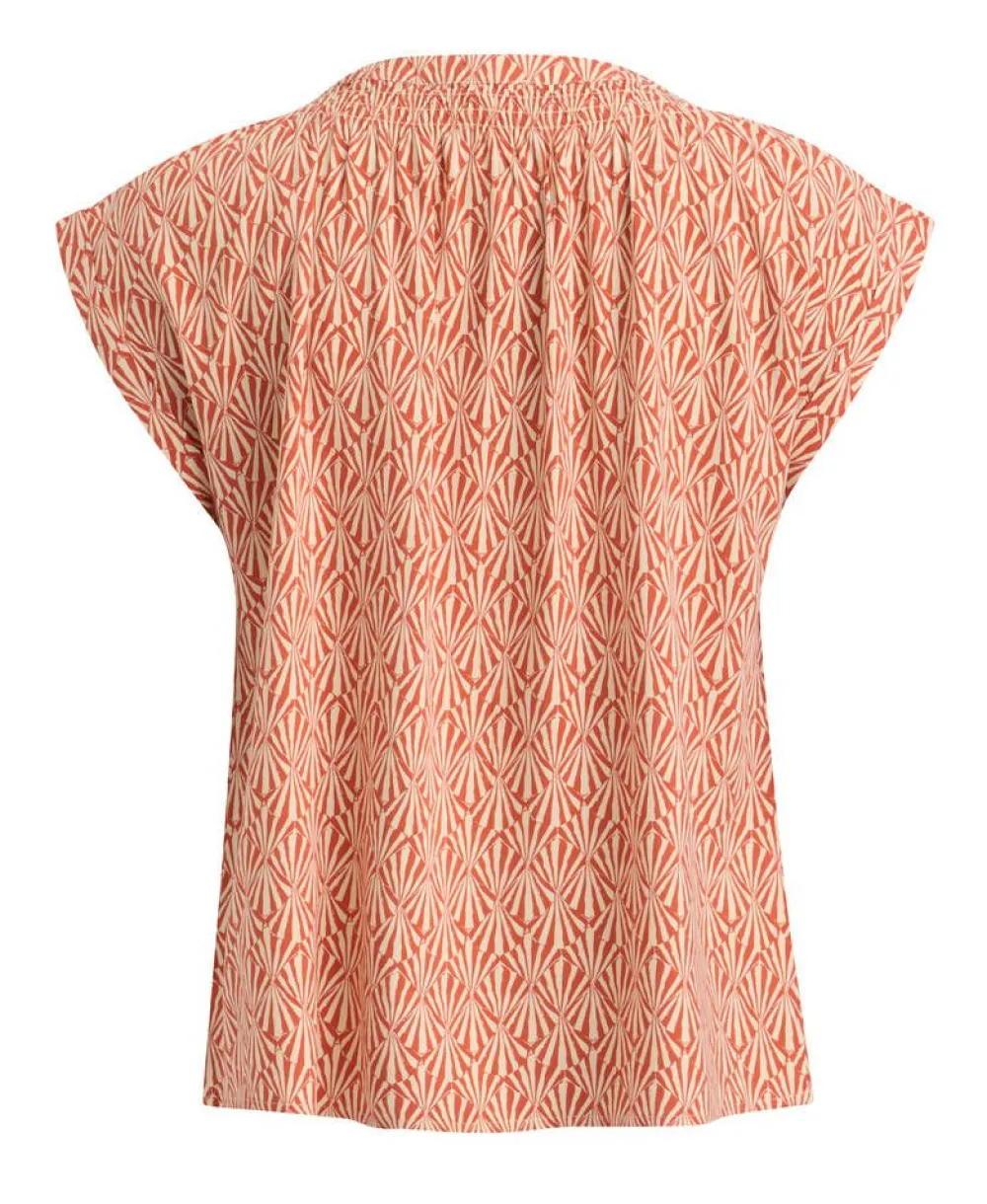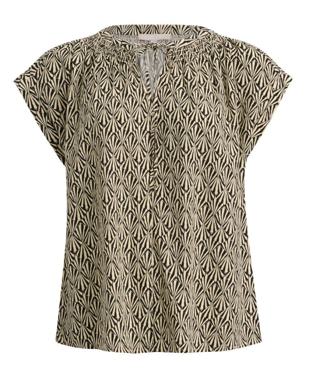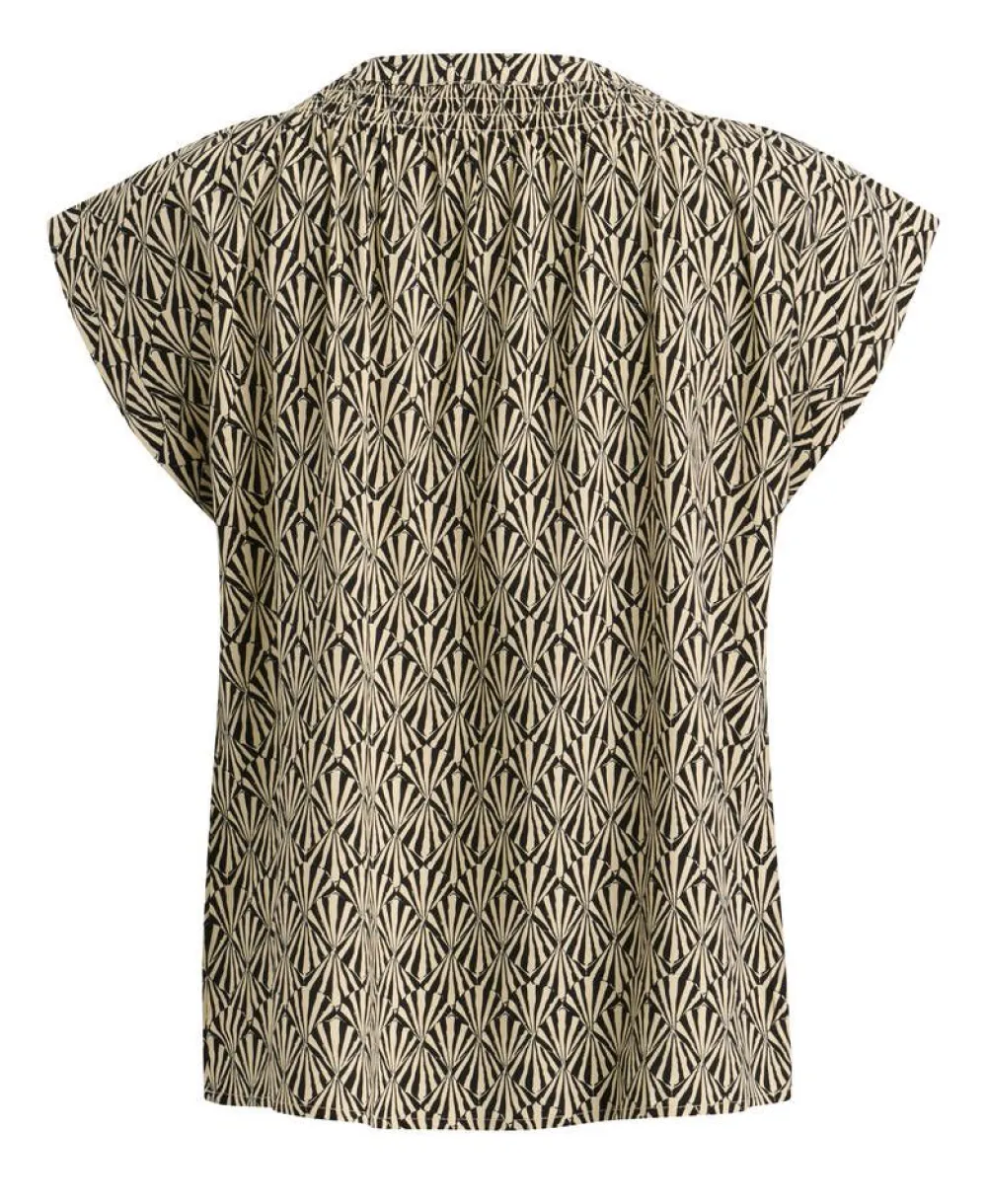 Kevyt viskoositoppi kaksivärisellä graafisella kuosilla. Pyöreähkö pääntie, jossa koristerypystystä ja narut.Lis…
