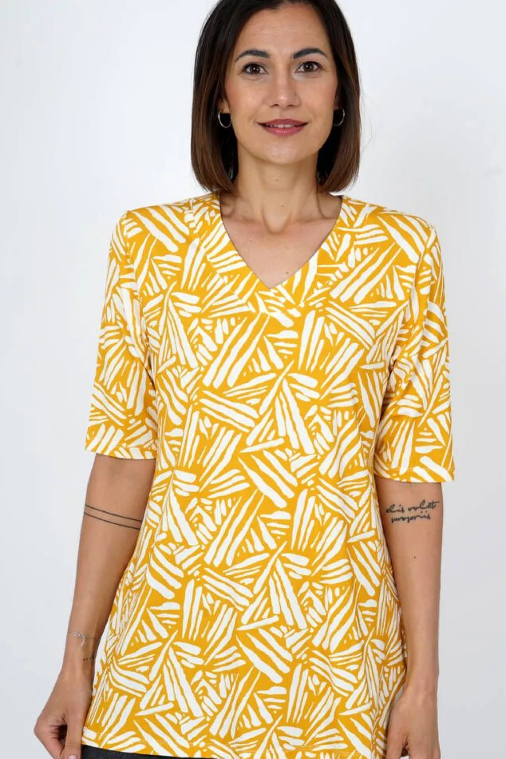 Joustava printtitunika V-pääntiellä ja lyhyillä hihoilla.Lisää tietojaRinnanympärys (koko S): 92 cmVyötärönymp…