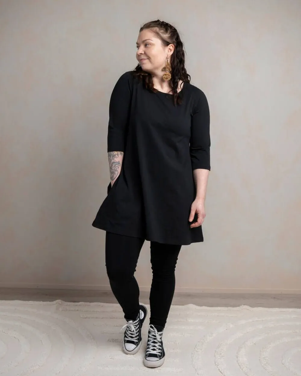 Alaspäin levenevä taskutunika 3/4 osa hihoilla. Yläosa on istuvampi ja tunikassa on pyöreä pääntie.Lisää tietoj…