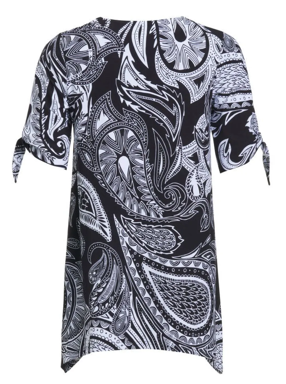 Paisleykuosinen trikootunika sivuilta pidemmällä hainpyrstöhelmalla. Lyhyissä hihoissa on solmittavat narut.Lisää …