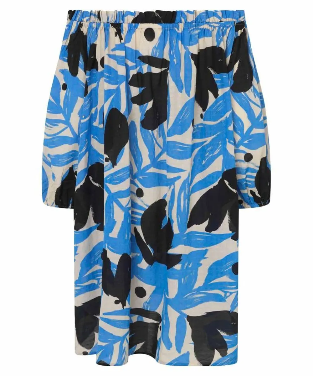 Kesäinen oversize tunika lehtikuosilla. Pääntiellä on kuminauha, joka mahdollistaa rennon istuvuuden jättäen olkap…