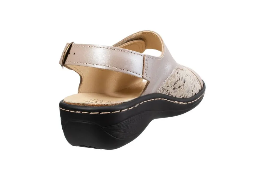 Naisten työsandaalit metallinhohtoisella nahkapinnalla. Sandaalien istuvuutta on helppo säätää kahden tarraremmin a…