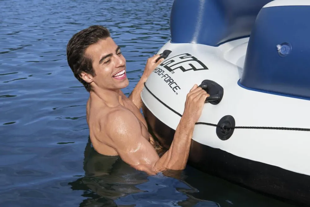 Pyöreän uimalautan kyytiin mahtuu neljä aikuista. Lautassa on leveät selkänojat leppoisaa istuskelua varten ja nelj…