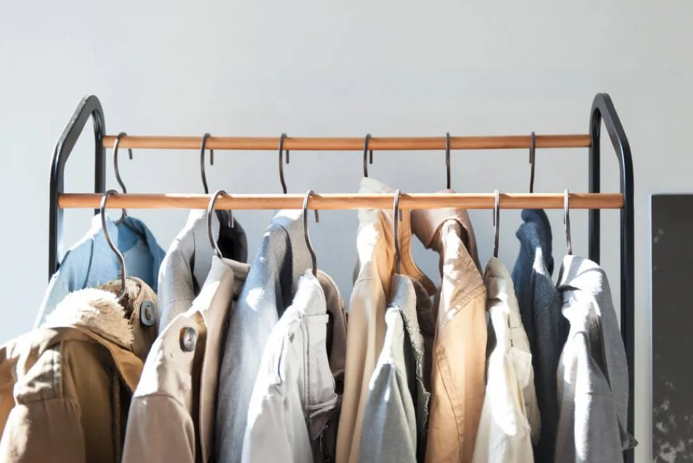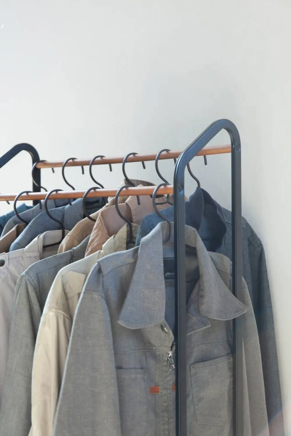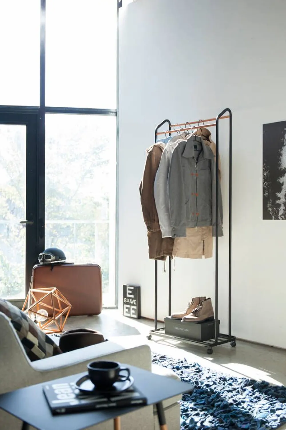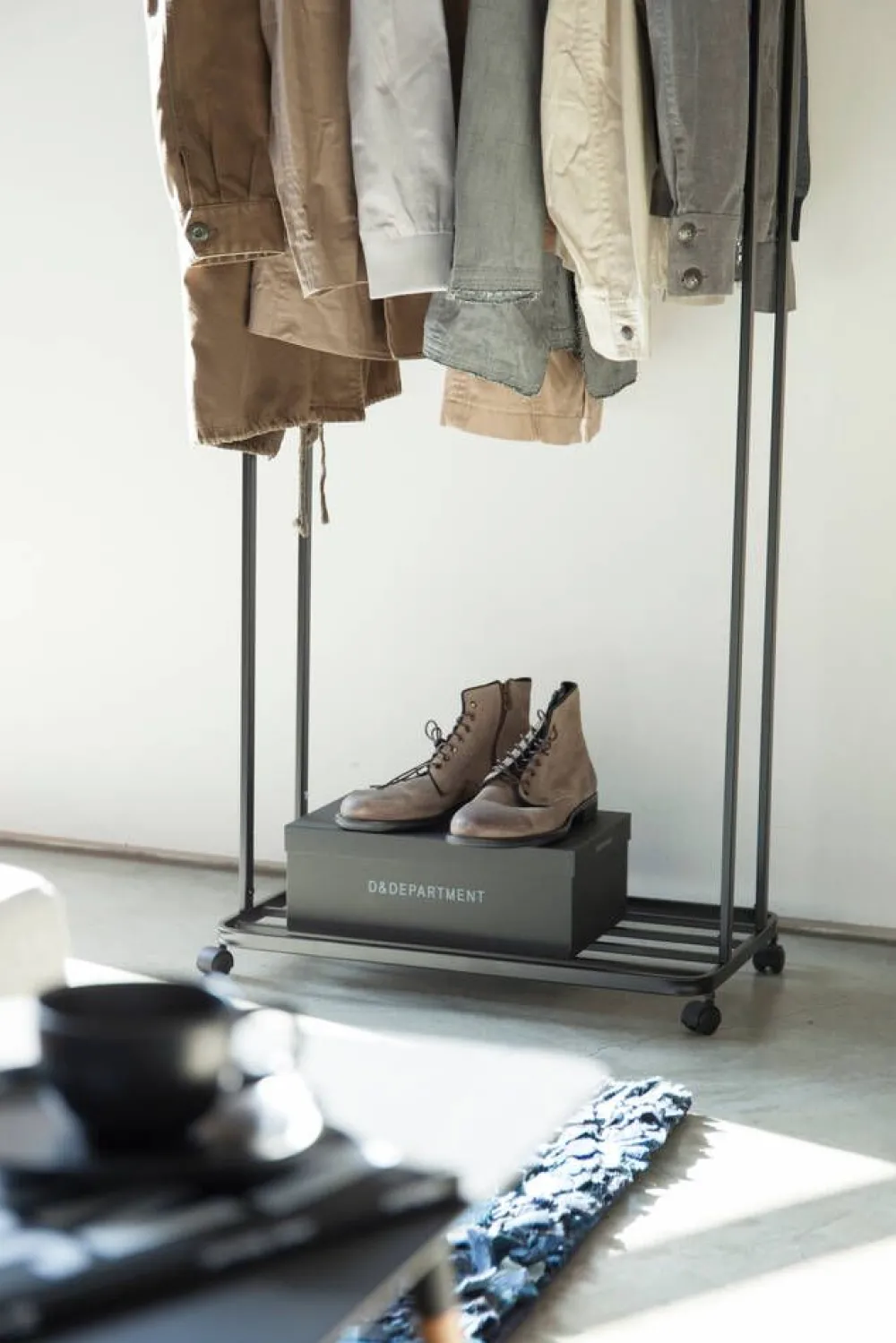 Yamazakin tilava ja käytännöllinen Tower-vaaterekki on varustettu pyörillä ja siinä on kaksi kaunista puutankoa va…