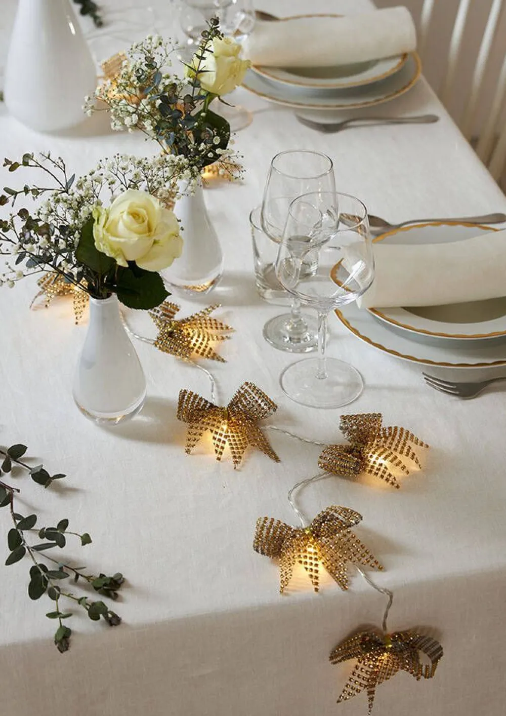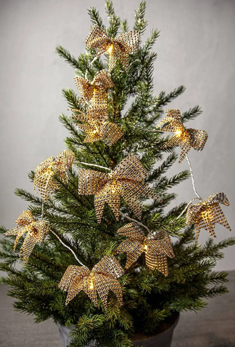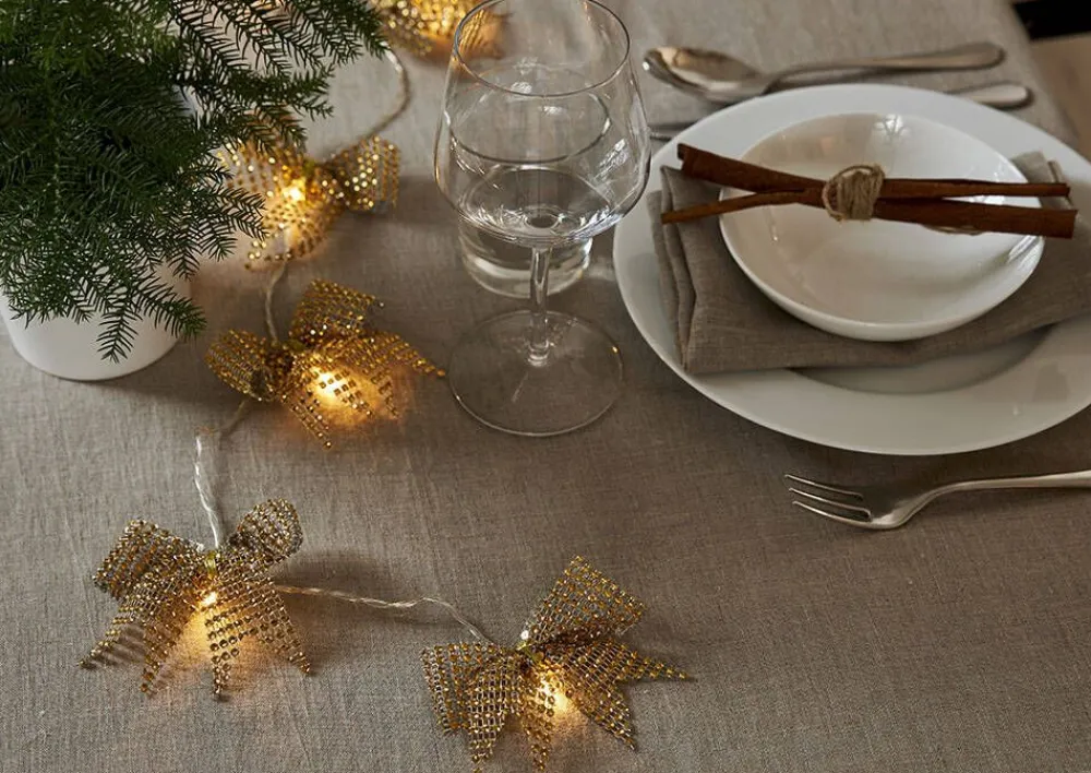 225 cm pitkä valosarja, jossa 10 kullanväristä rusettia lämpimän valkoisilla LED-valoilla. Sopii sisäkäyttöön e…