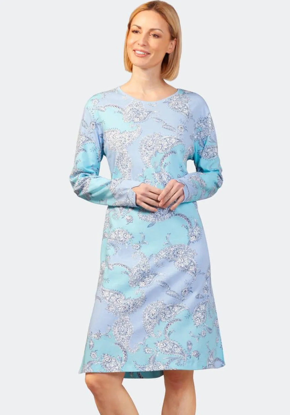 Hempeän värinen ja miellyttävä puuvillainen mekkoyöpaita klassisella paisleyprintillä pitkillä hihoilla.Lisää t…