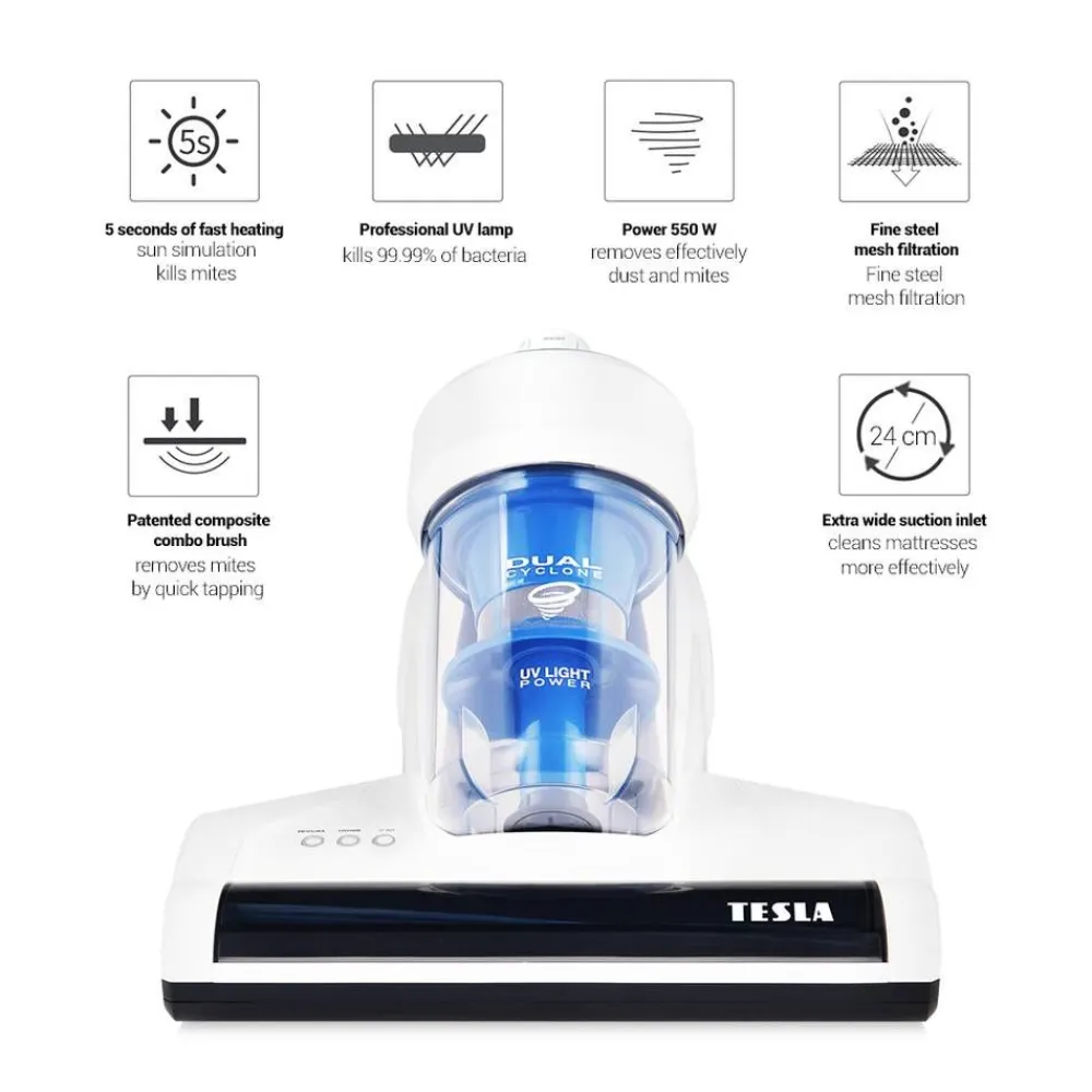 | Tehokas UV-C ultraviolettivalo tuhoaa 99,9% mikrobeista, allergeeneista ja punkeista. |