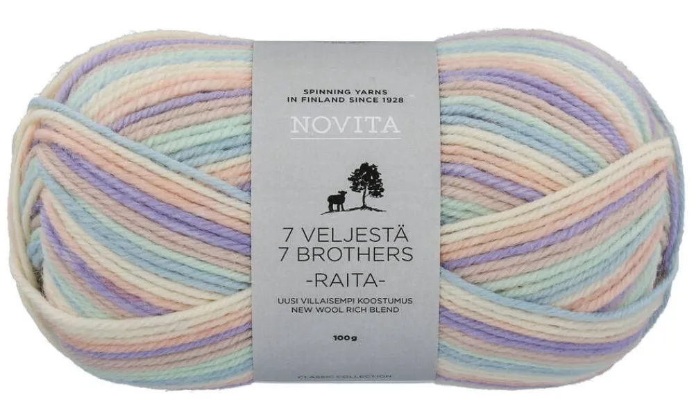 Novita 7 Veljestä Raita -langasta saat tasaraitaiset villasukat. Puikkosuositus 4, sukkiin 3.5. Konepesu 40 asteessa. 1…