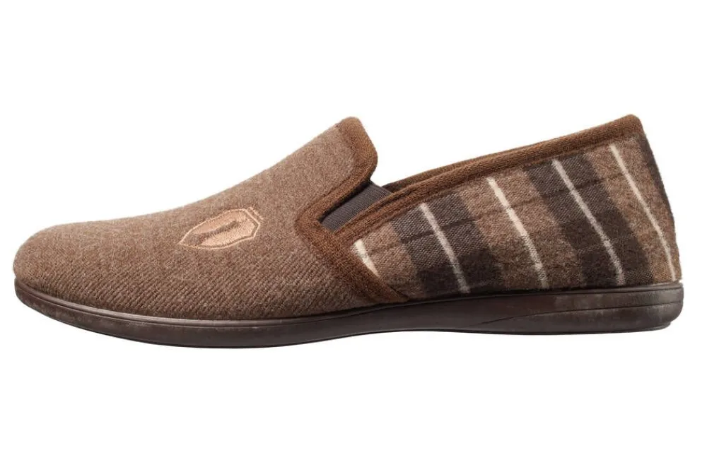 Miesten huopa-aamutossut umpikannalla. Tossuissa on ruutukuvioita ja brodeerauskoriste.Lisää tietojaVuorin materiaali:…