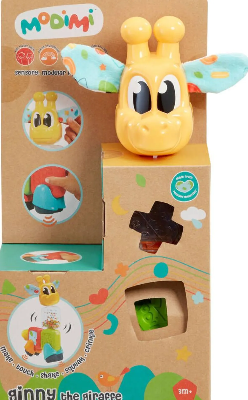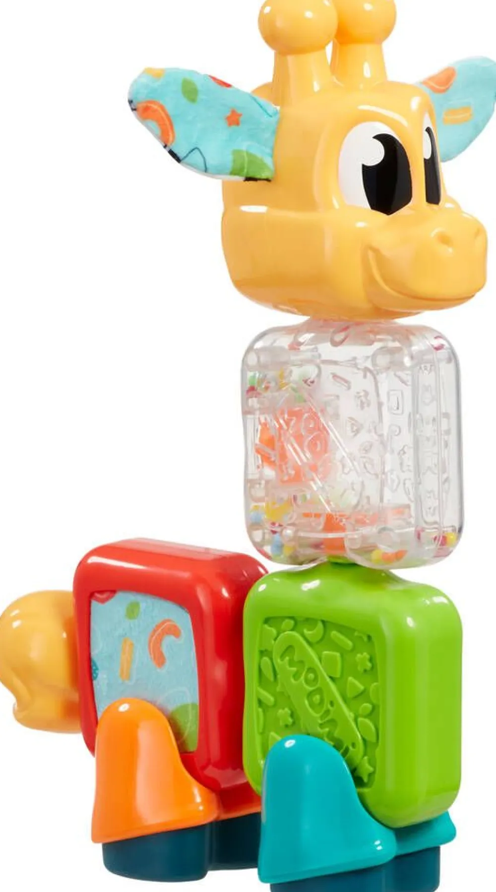 Kiva kirahvilelu kootaan taaperon käteen sopivista paloista. Kirahvilla on rapisevat korvat ja yhdessä palikassa on …