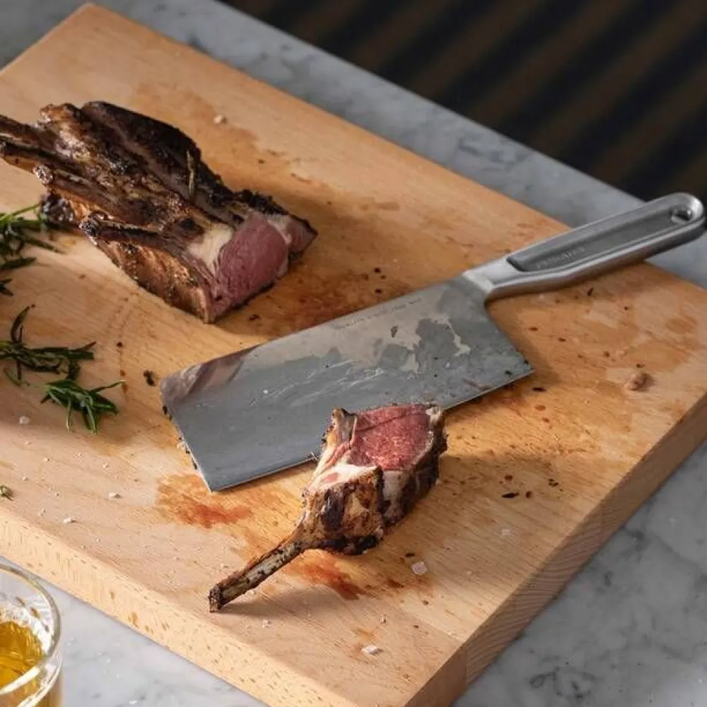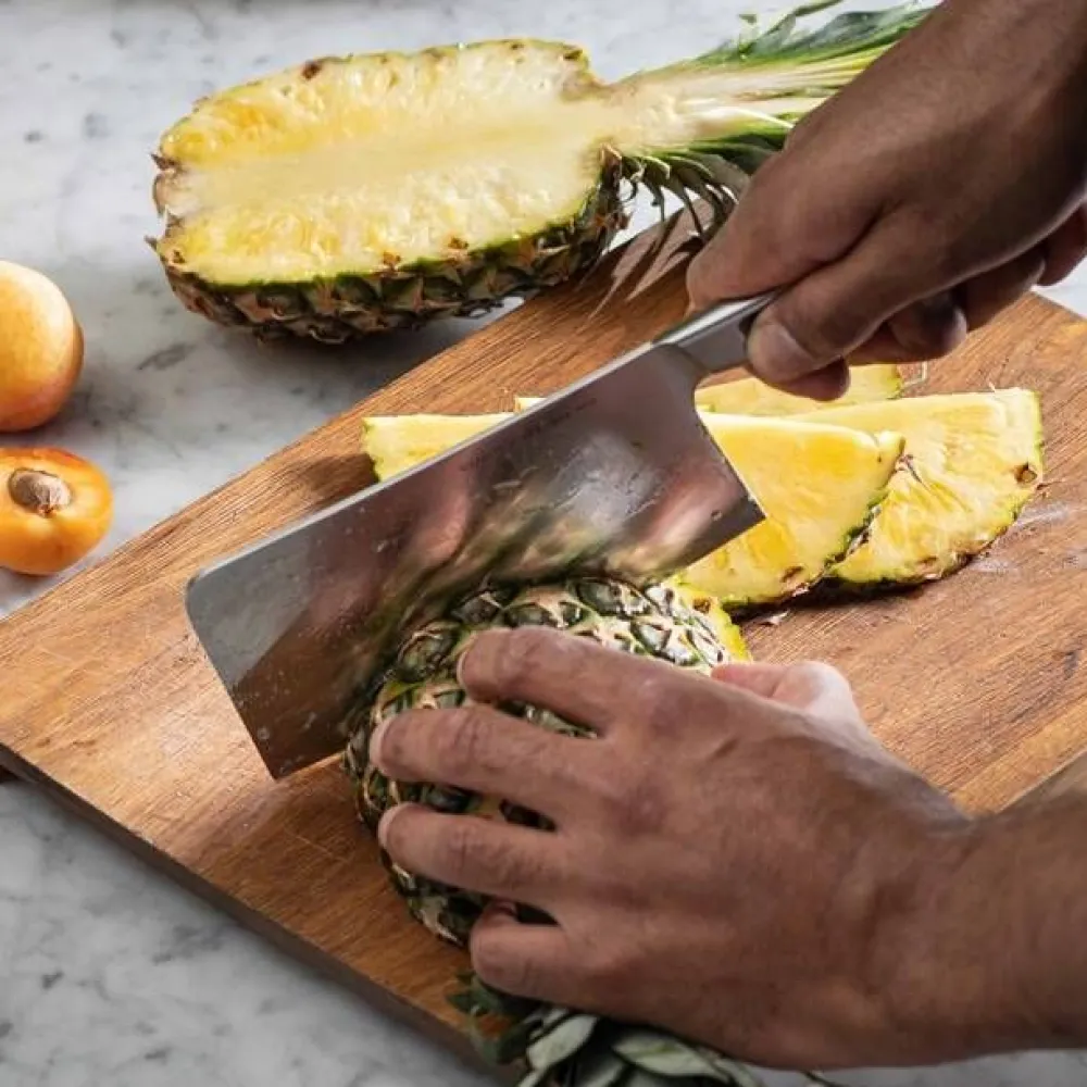 | Leveä terä soveltuu esimerkiksi lihan, kalan, kovien vihannesten ja luiden pilkkomiseen sekä leikkaamiseen |
