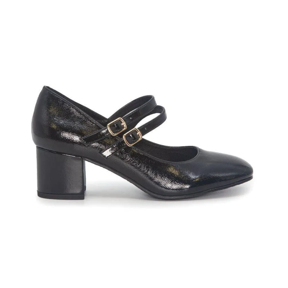 Mustat ja kiiltävät avokkaat matalalla tolppakorolla. Päällä on kaksi kapeaa solkikiinnitteistä remmiä.Lisää ti…