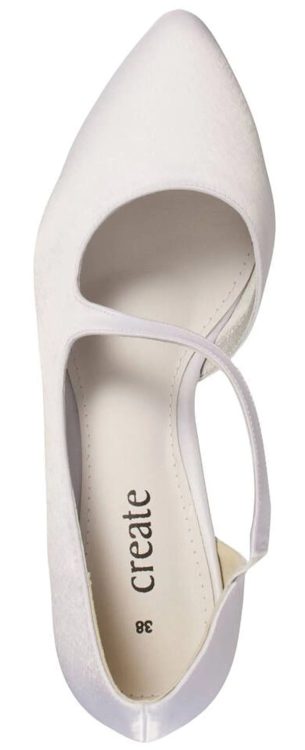 Valkoiset satiiniavokkaat pehmustetulla sisäpohjalla ja sirolla korolla. Päällipuolen poikittaisremmissä on käyttö…