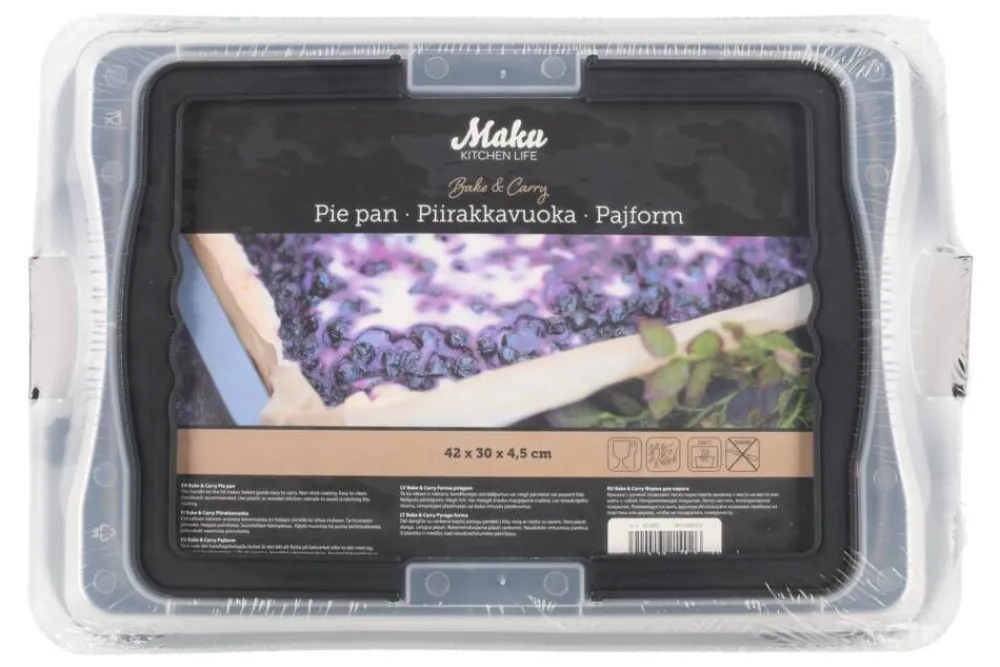 | Mitat:Leveys 42 cm. Syvyys 30 cm. Korkeus 4,5 cm. Vetoisuus 3,45 litraa. Paksuus 0,4 mm. |