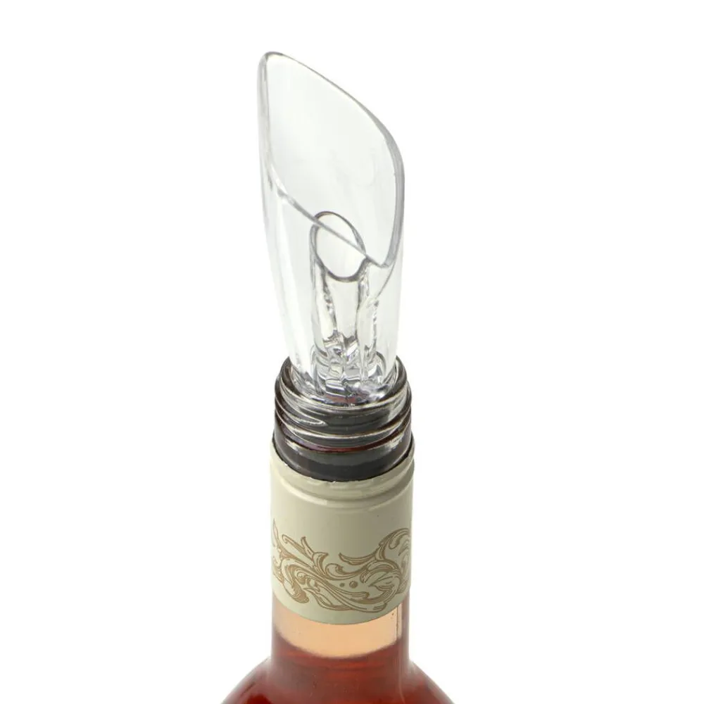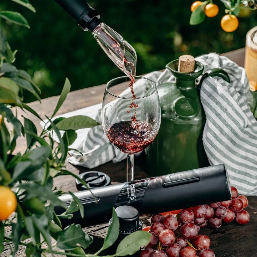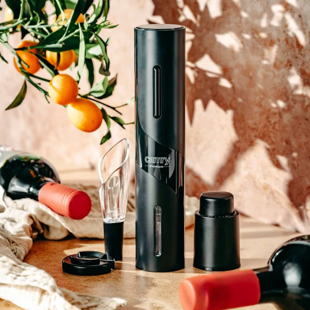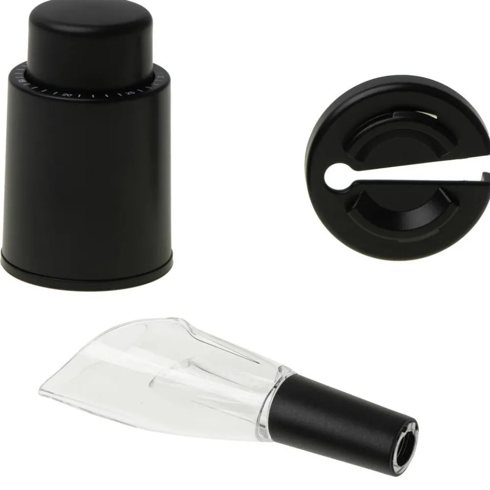 | Setissä on käytännöllinen folionleikkuri, joka poistaa tarkasti suojafolion mistä tahansa pullosta. |