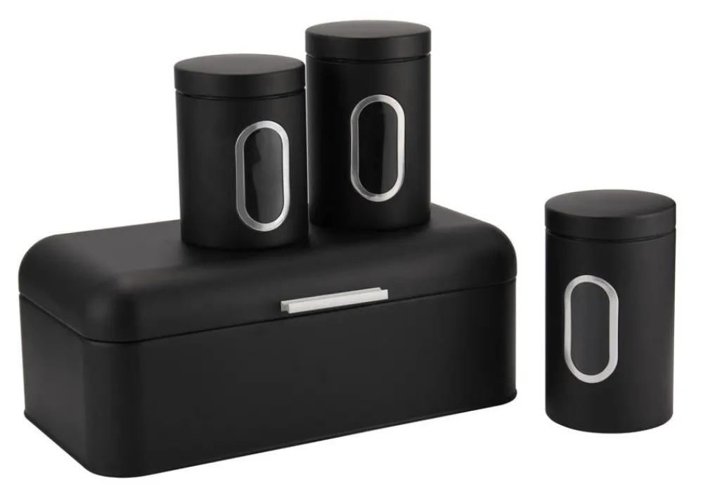 | Mitat:Leipälaatikko: 42,5×22,5×16 cm. Purkit: Ø11×15,5 cm, Ø11×17,5 cm, Ø11×19,5 cm |