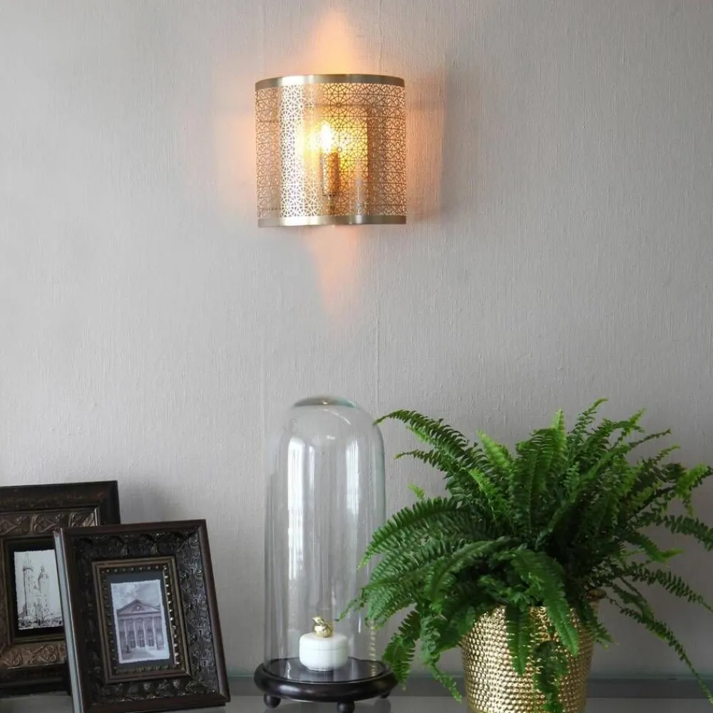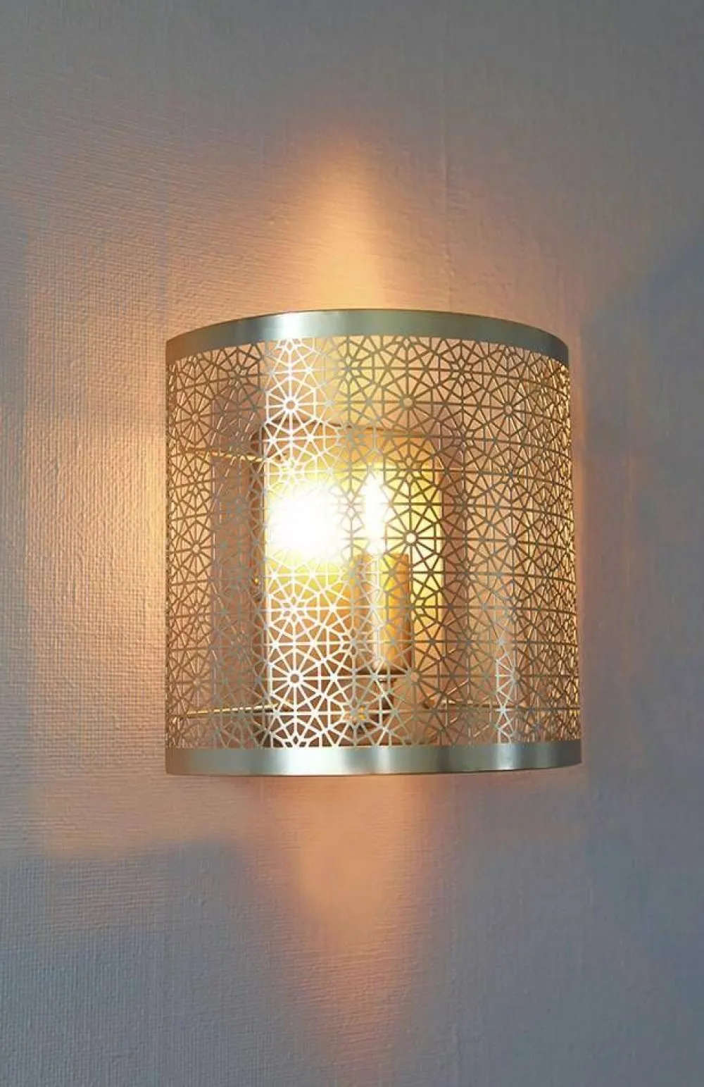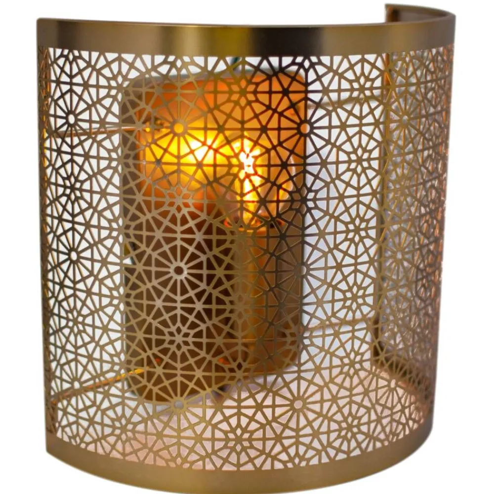 Hermine on mattamessingin värinen, elegantti seinävalaisin. Valo heijastuu kauniisti kukkakuvioidun varjostimen läpi …