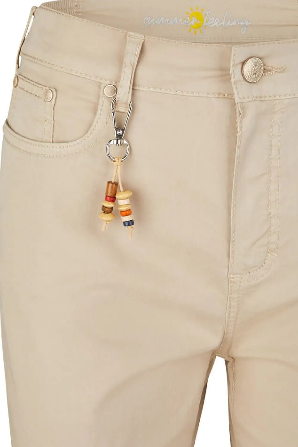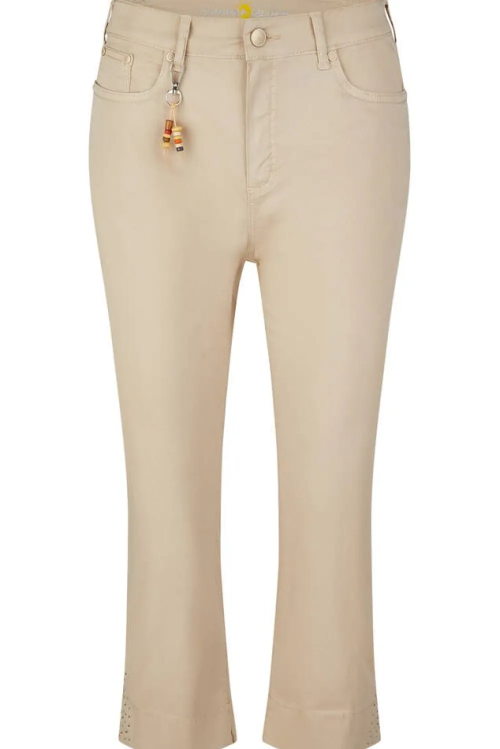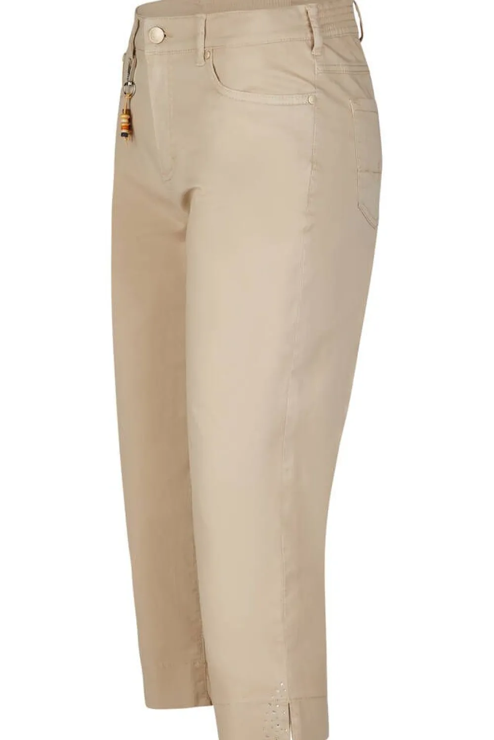 Trendikkäät caprit 56 cm lahkeella. 5-taskumalli ja vyönlenkissä koristenauha. Vyötärön sivuilla on joustavat kum…