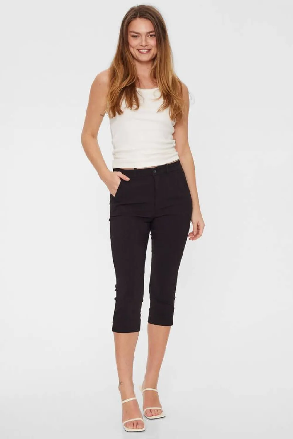 Tyylikkäät ja monikäyttöiset slim fit-malliset caprihousut. Housuissa on korkea vyötärö, joka korostaa vartalon l…