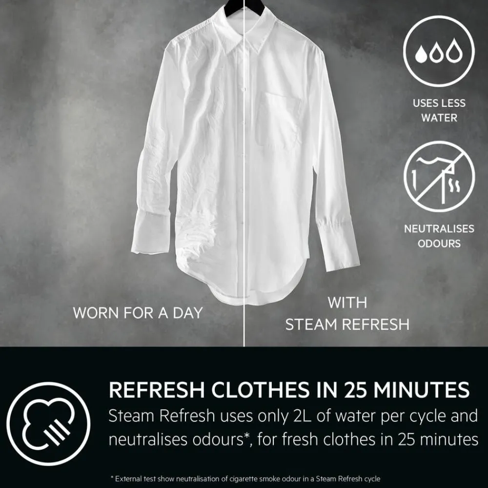 | Steam Refresh poistaa vaatteista hajun ja rypy 25 minuutissa – myös vaatteista jotka vaativat hellävaraista käsittelyä. Mikäli haluat vielä raikkaamman tuntuman voit lisätä aromaattisen höyrytuoksun. |
