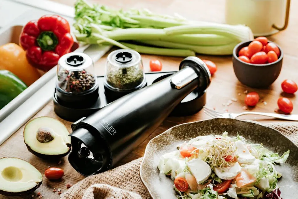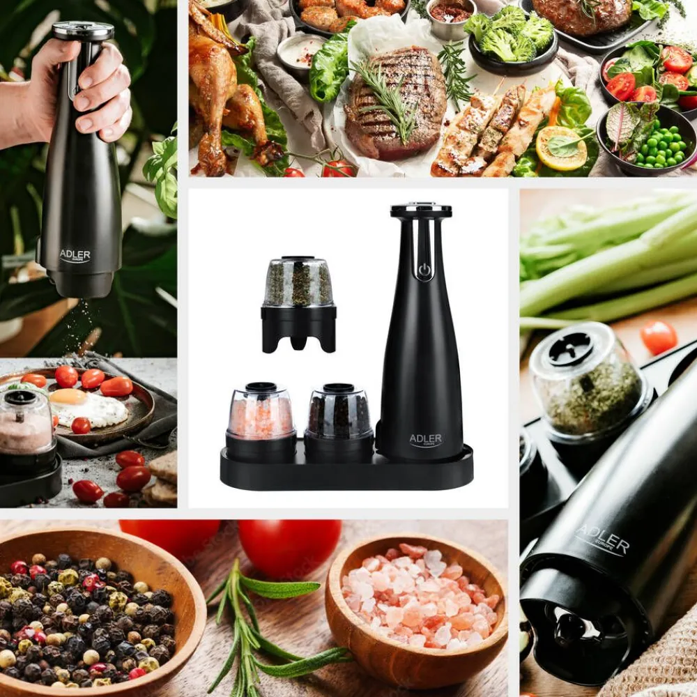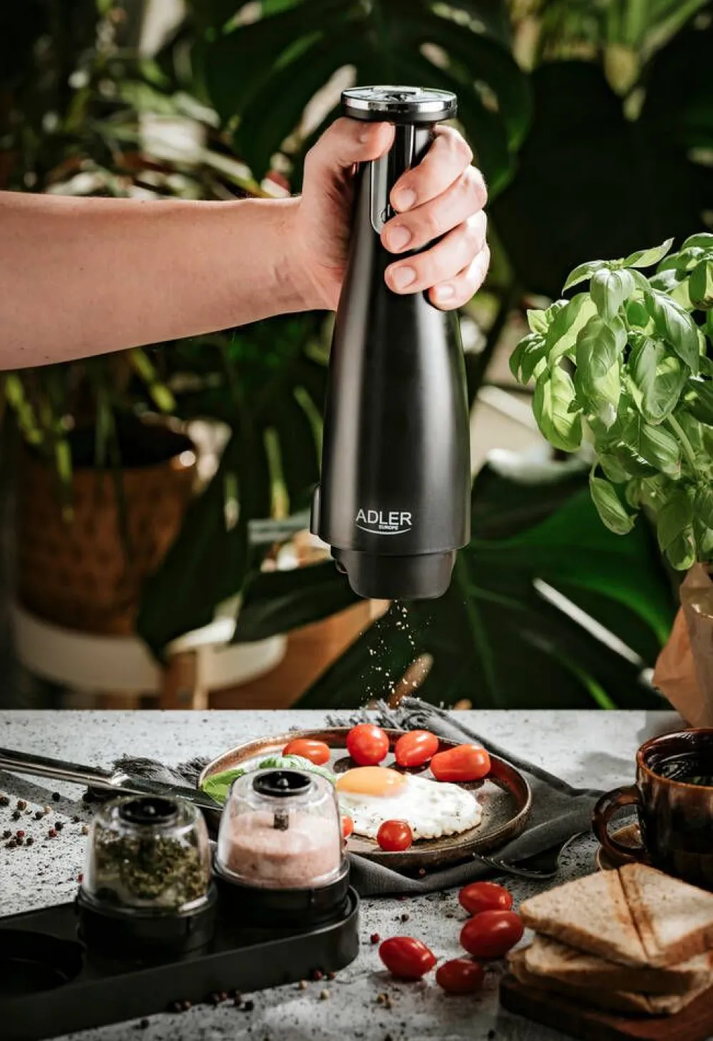 | Yhden myyntipakkauksen sisältö:Pohja, 3 vaihdettavaa myllyä, alusta, USB-latauskaapeli |