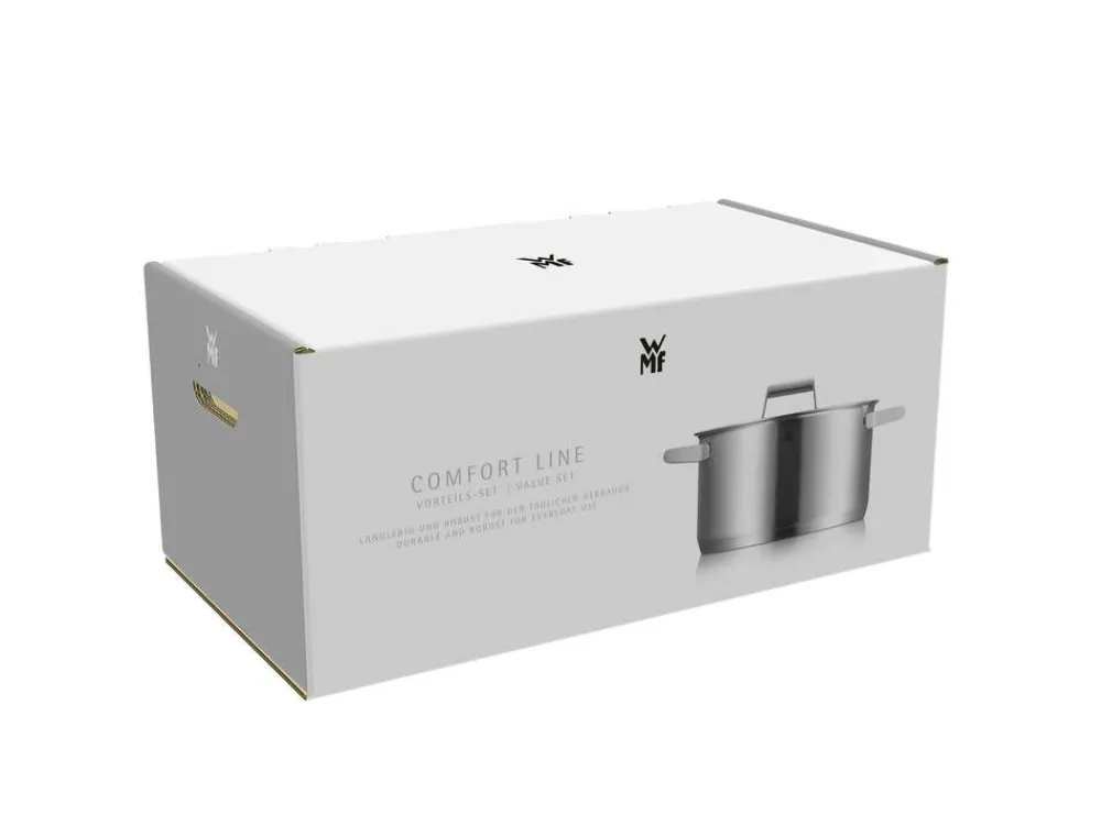 | Yhden myyntipakkauksen sisältö:Korkea kattila kannella 24cm/5,7l. Korkea kattila kannella 20cm/3,3l. Korkea kattila kannella 16cm/1,9l. Matala kattila kannella 20cm/2,5l. Keittokasari 16cm/1,5l ilman kantta |
