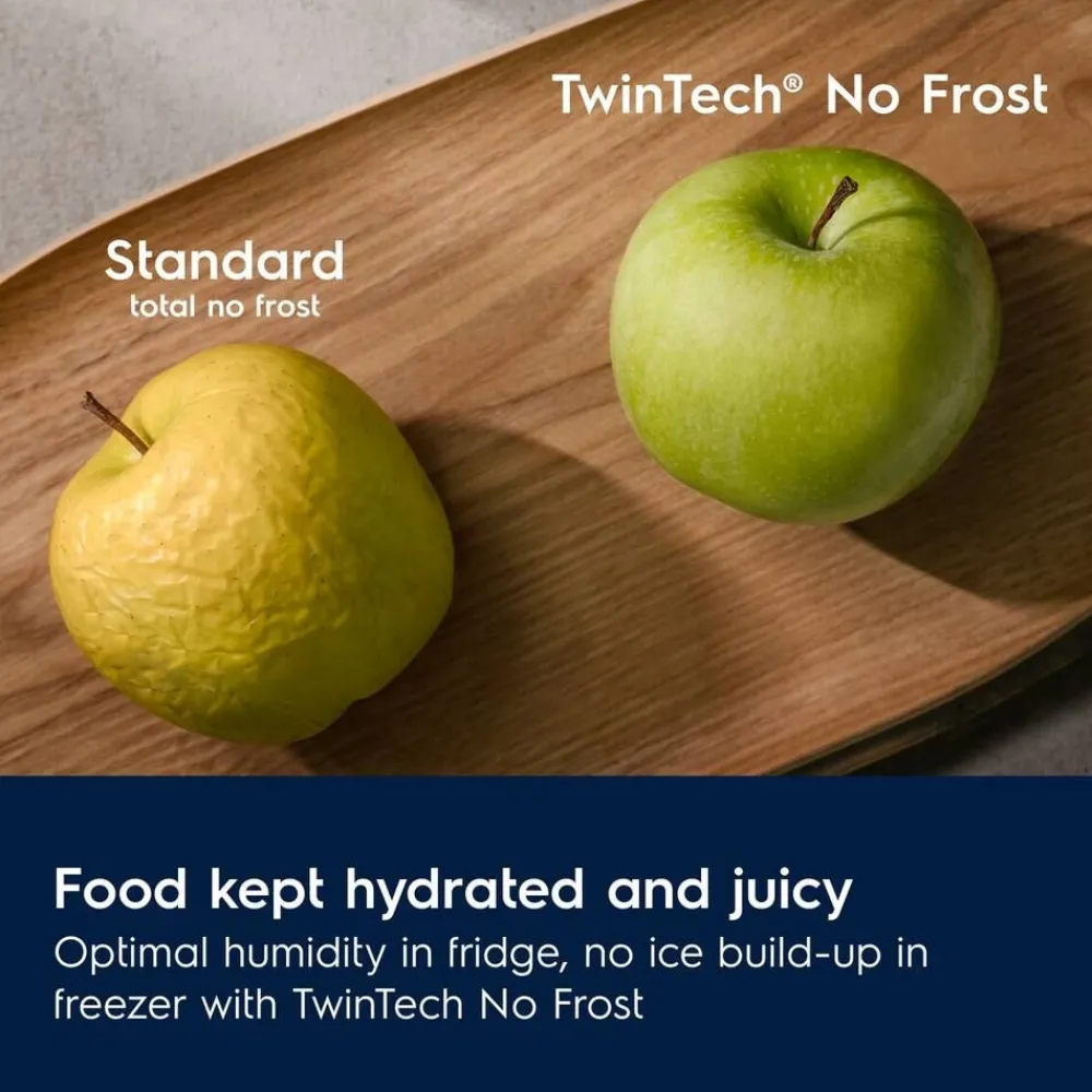 | TwinTech® NoFrost -teknologian kaksoisjäähdytysjärjestelmä kierrättää ilman erikseen jääkaapissa ja pakastimessa. Tämän ansiosta ruoka ei kuivu jääkaapissa, eikä pakastimeen muodostu huurretta – parempaa säilyvyyttä ilman sulatusvaivaa. |
