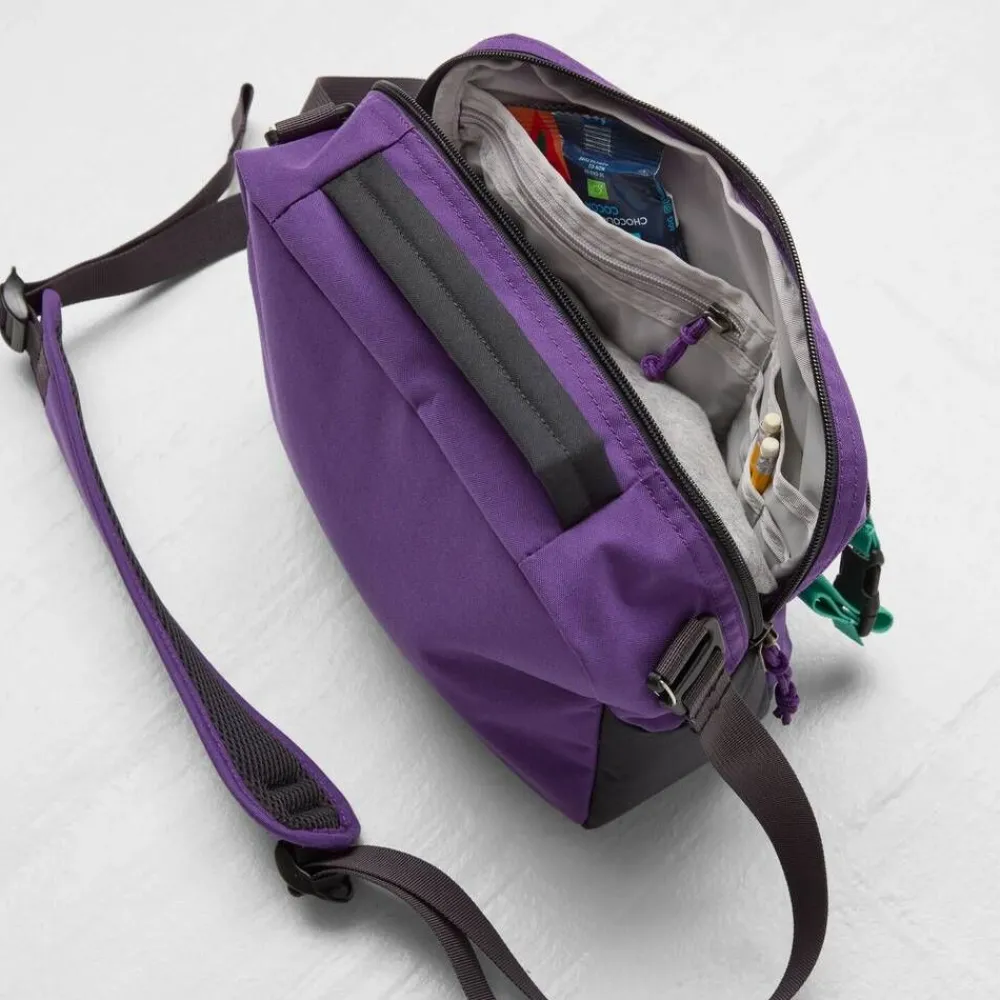 | Edessä vetoketjullinen tasku ja nauhat, joihin voi kiinnittää lisävarusteita. |