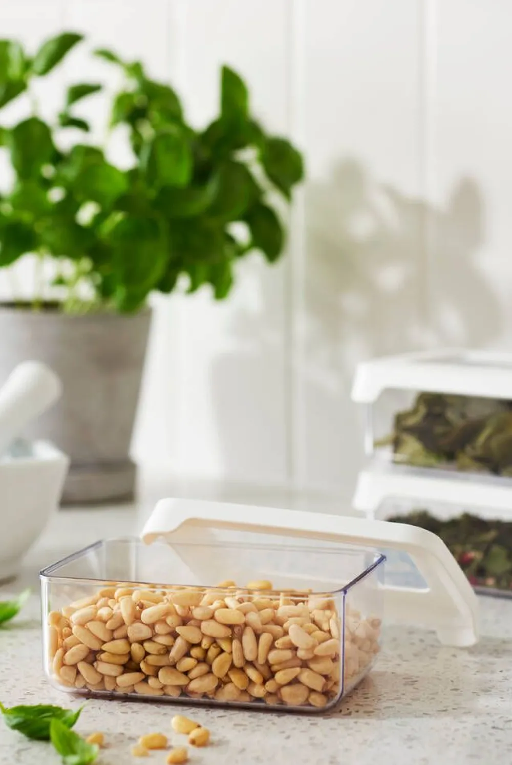 Ilmatiivis purkki kuivaruoka-aineiden säilyttämiseen. Vetolaatikossa purkin sisällön näkee läpinäkyvän kannen an…