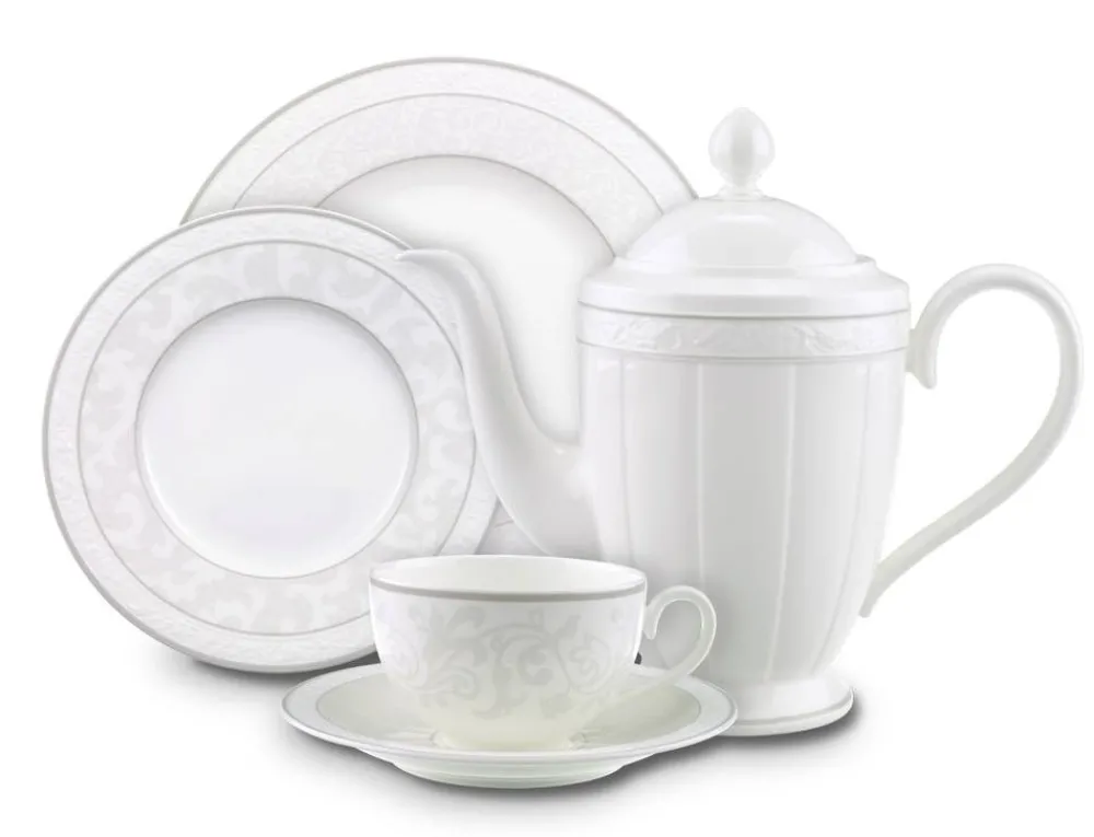 Gray Pearl astiasto on ylellistä, vitivalkoista luuposliinia. Koristeluna herkkä helmen harmaa siirtokuva ja lautasosi…