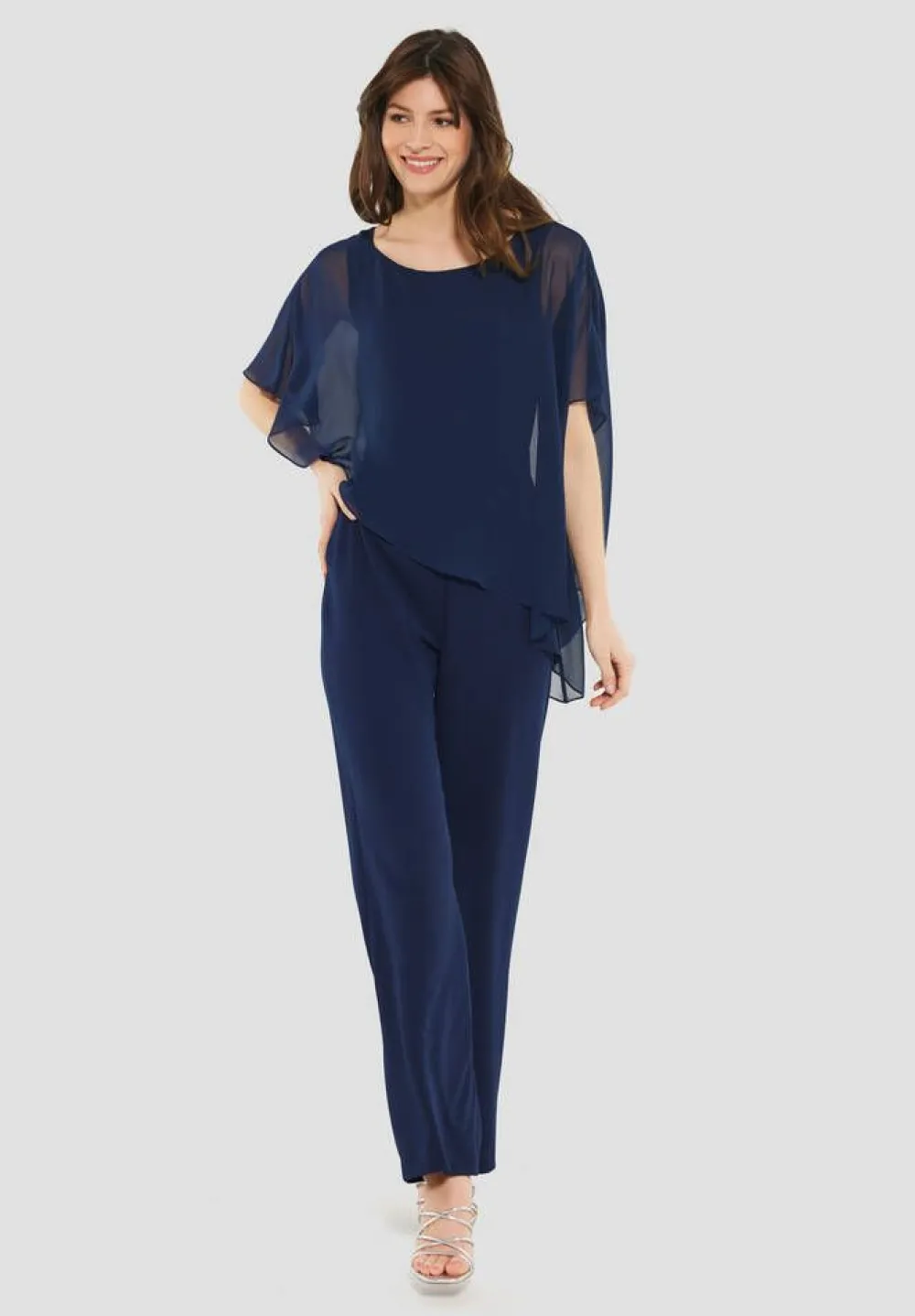 Näyttävä yksivärinen haalari suorilla lahkeilla. Yläosaa peittää läpikuultava sifonkiponcho.Lisää tietojaHoito…