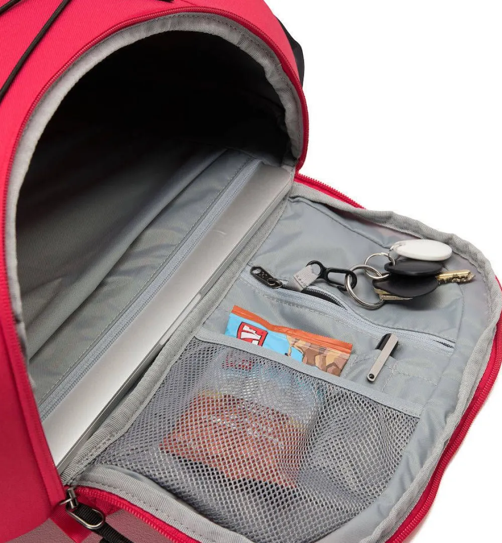 | Päälokeron sisällä vetoketjullinen tasku, joka sopii tabletille, pienempi vetoketjullinen tasku laukkutilassa, joustava sivutasku vesipullolle tai varusteille, sisäinen järjestelijä pienille tavaroille |