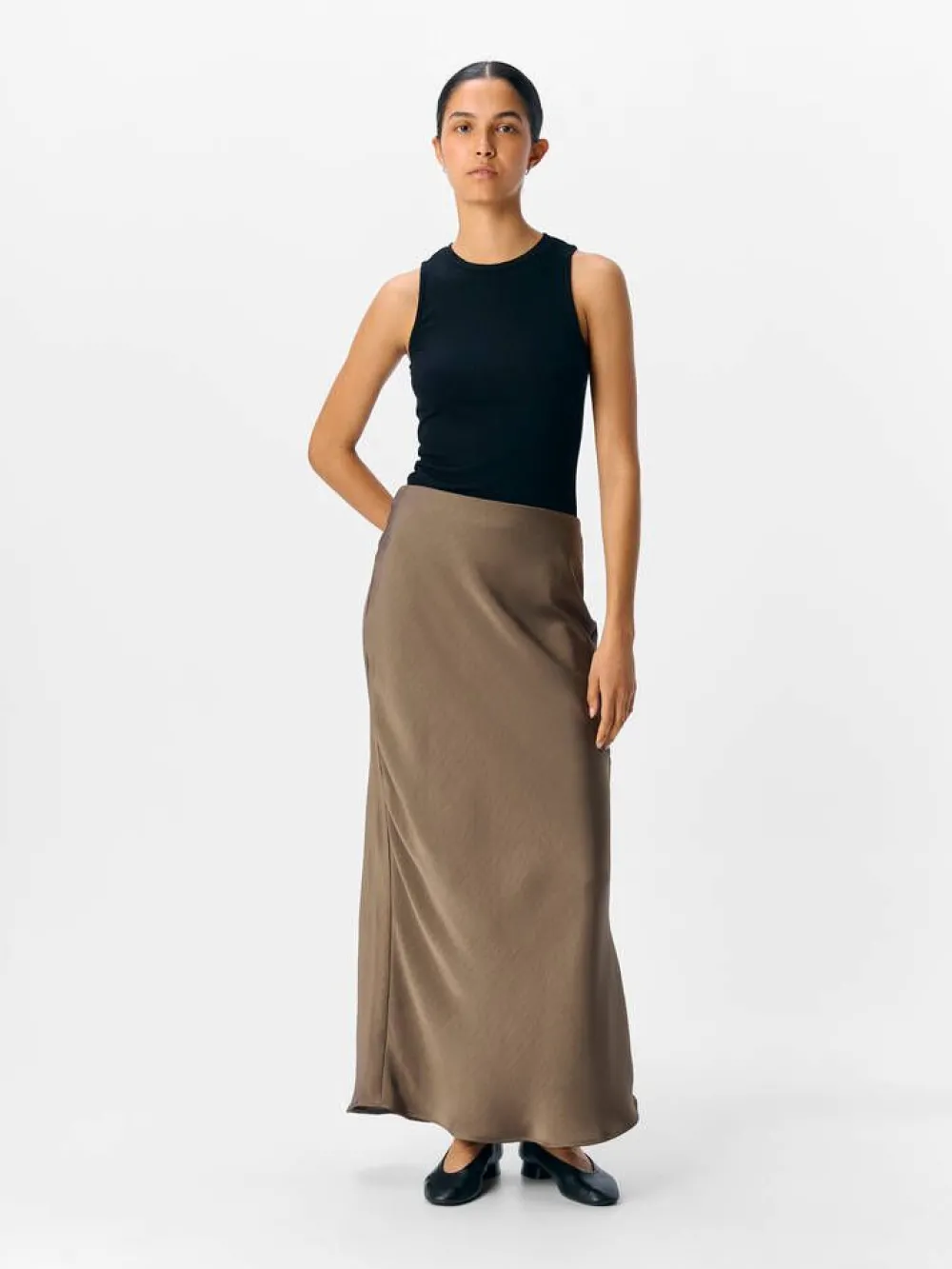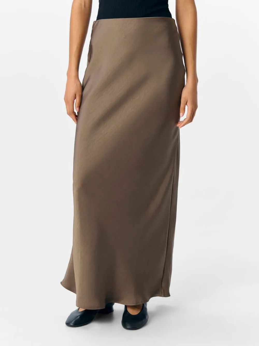 Upea ja elegantti pitkähelmainen satiinihame joka hurmaa yksinkertaisella tyylikkyydellään. Keskikorkea vyötärö jo…