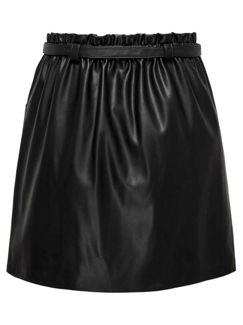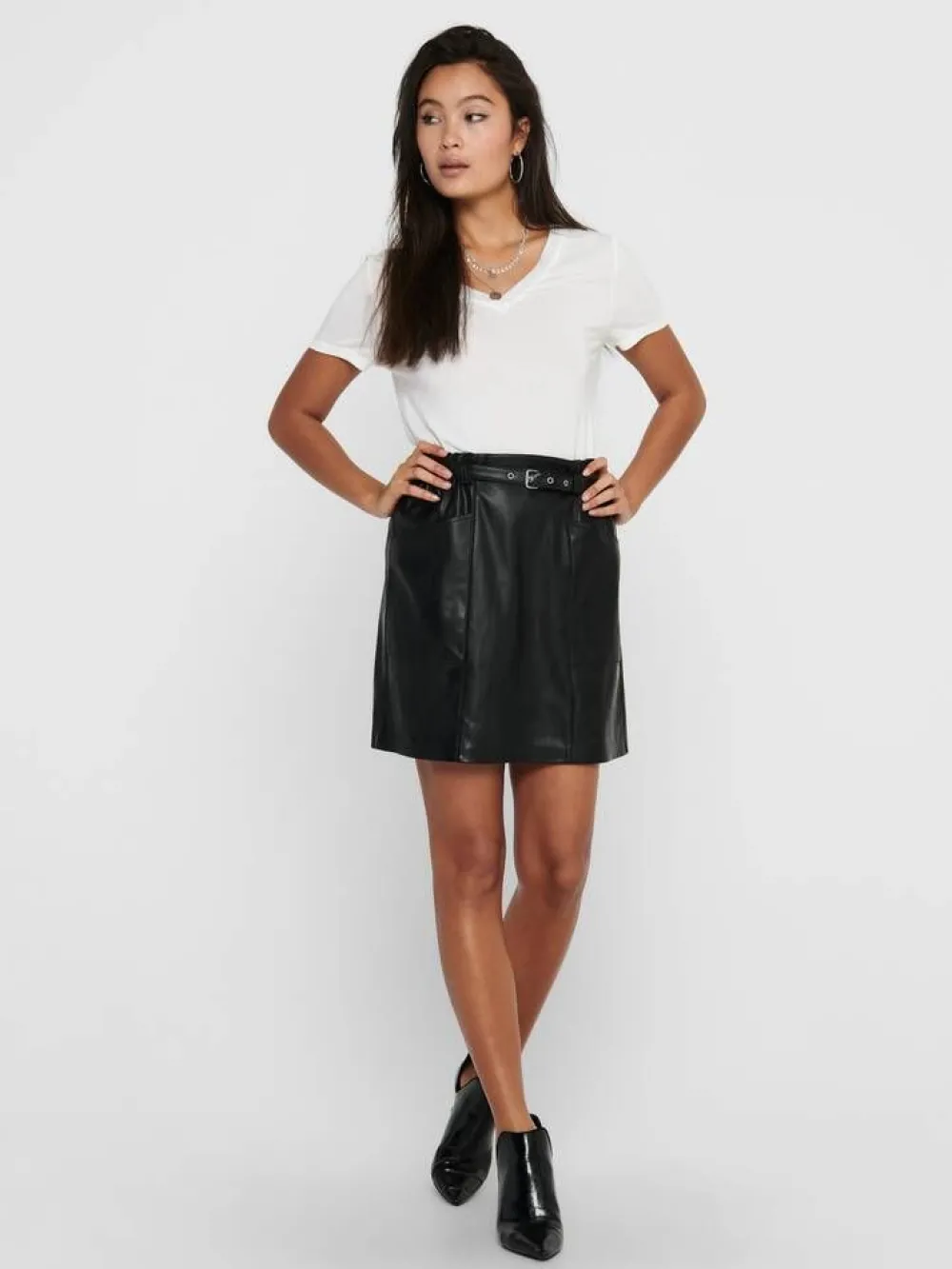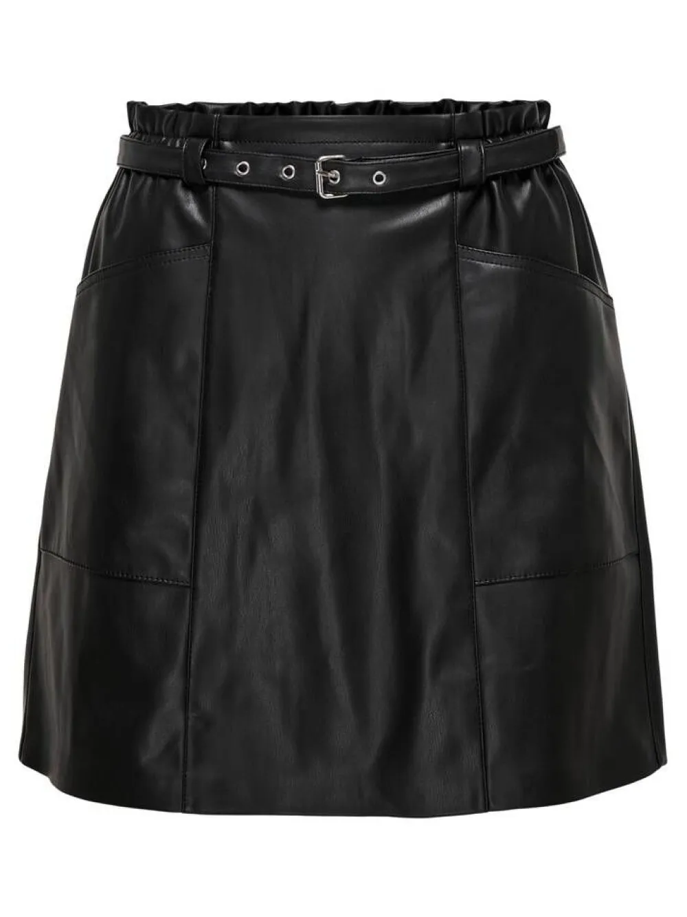 Huippumuodikas ja monikäyttöinen lyhyt nahkajäljitelty hame hieman levenevällä helmalla. Hameessa on käytännölli…