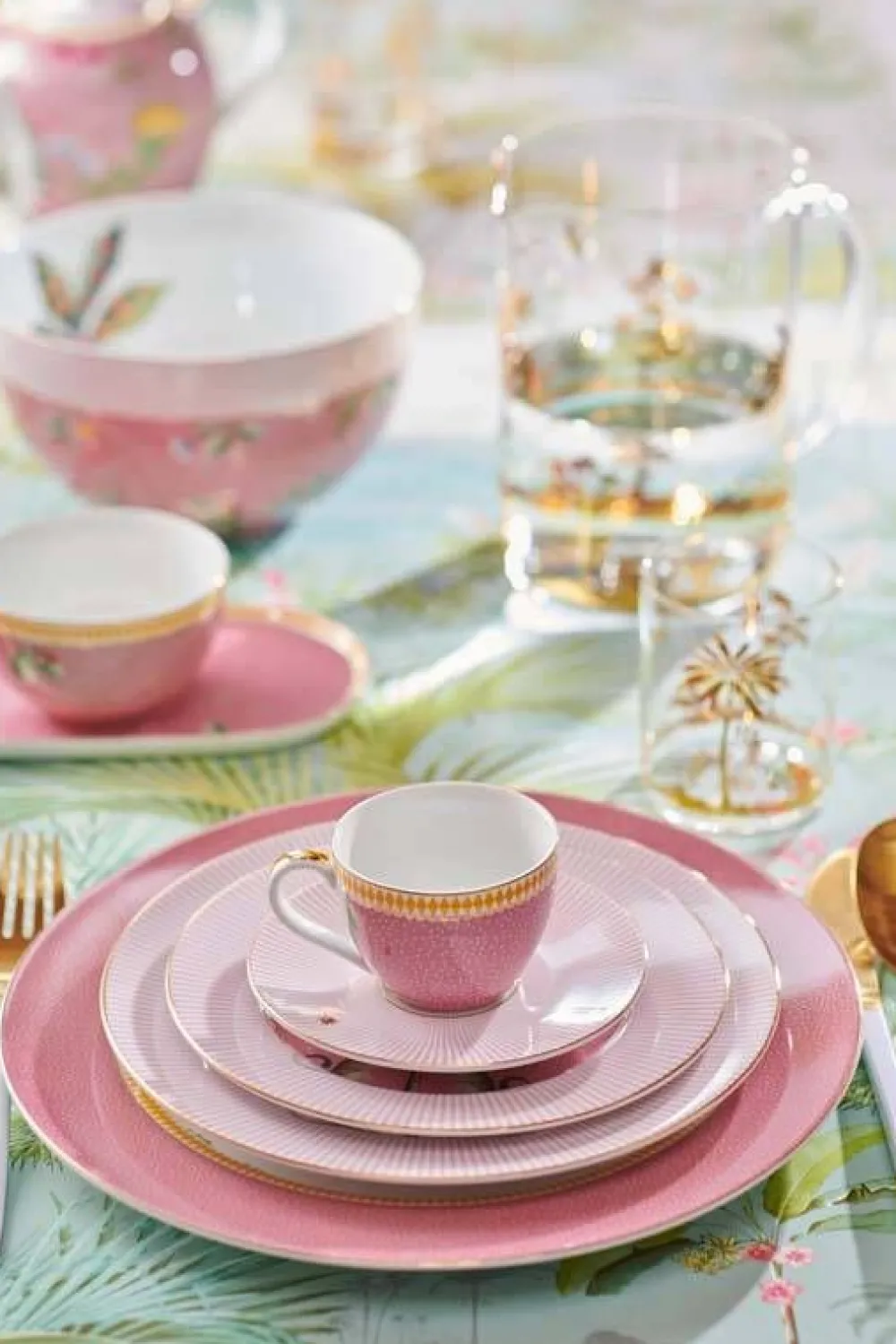 | La Majorelle -kokoelmassaan Pip kunnioittaa kauniita kasvitieteellisiä puutarhoja, joissa on suuri valikoima värikkäitä kukkia ja oksia ympäri maailmaa. Tämä eläväinen kukkien näyttely yhdistyy leikkisästi viittaukseen palmuihin ja majesteettisiin haikaroihin. Taustan pisteet ja raidat luovat tälle designille yllättävän yhdistelmän ja modernin säväyksen. La Majorelle -astiakokoelma on saatavilla kauniin vaaleanpunaisena ja upeana keltaisena, ja siihen kuuluu myös lasiesineitä, joissa on satumainen kultainen maisema. |