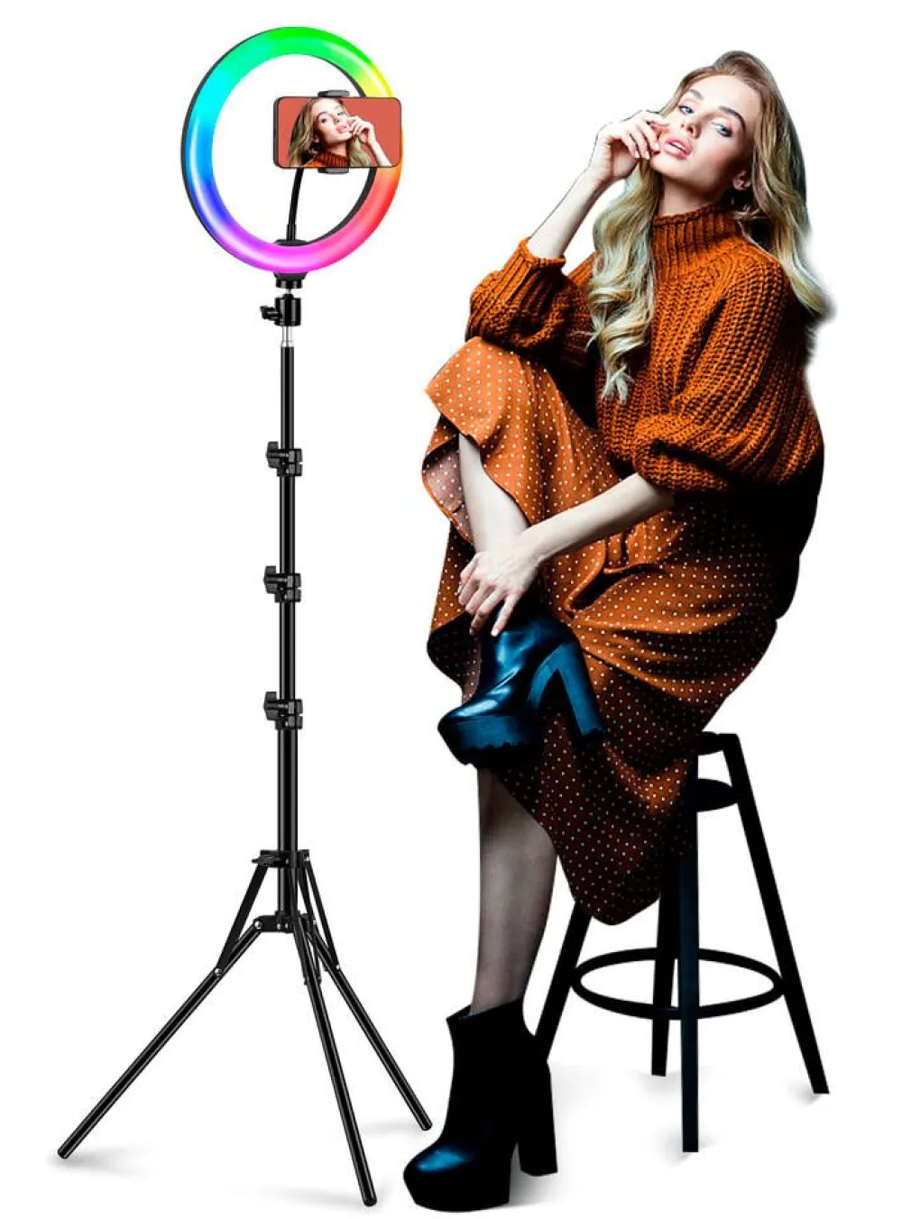 | Sis. valo, säädettävä kolmijalka, puhelinpidike (5,5-8 cm), USB-virtajohto |