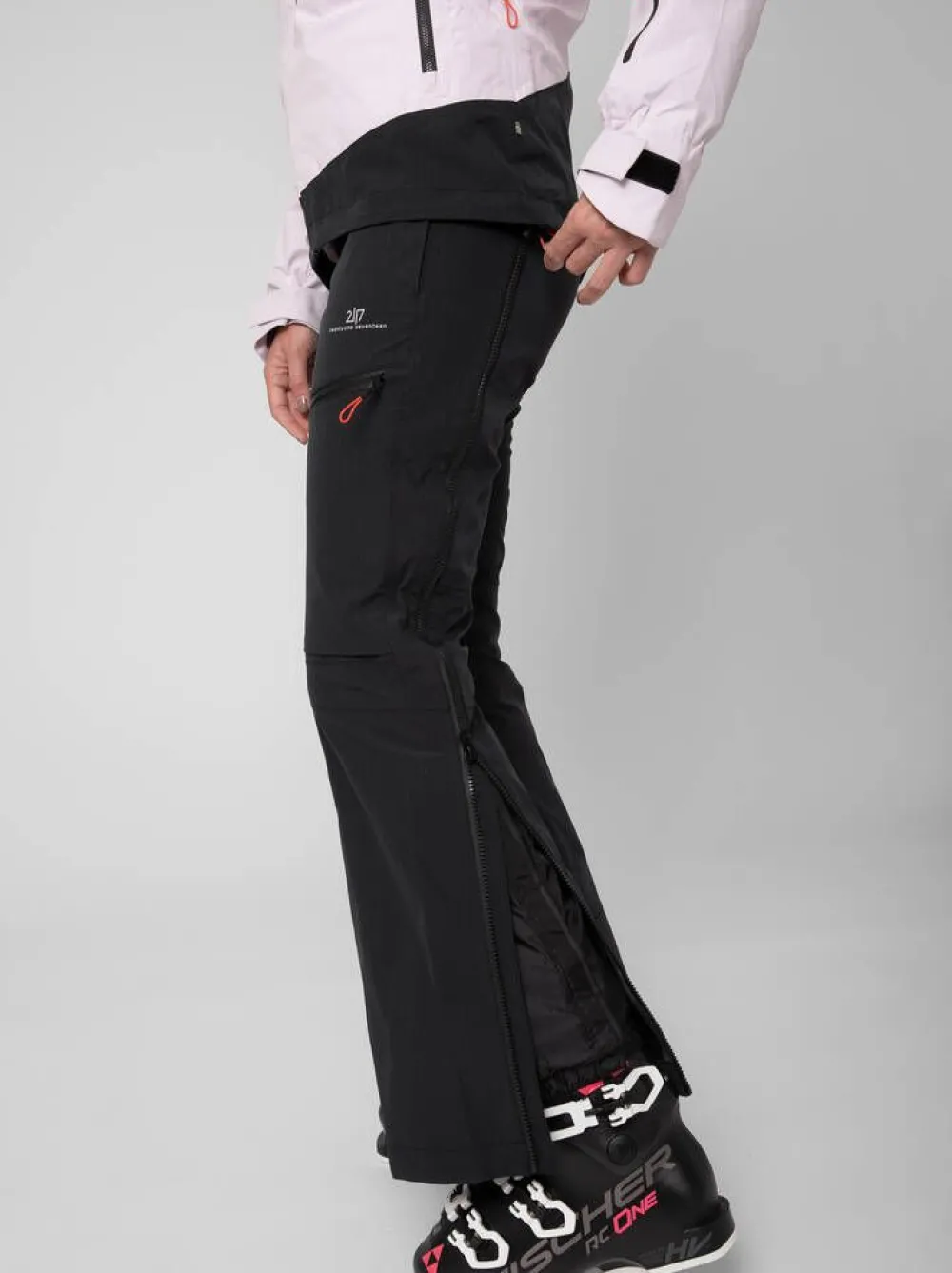 Housuissa irrotettavat henkselit, kaksi sivutaskua ja yksi tasku reidessä. Takana pitkät tuuletusvetoketjut ja sääde…