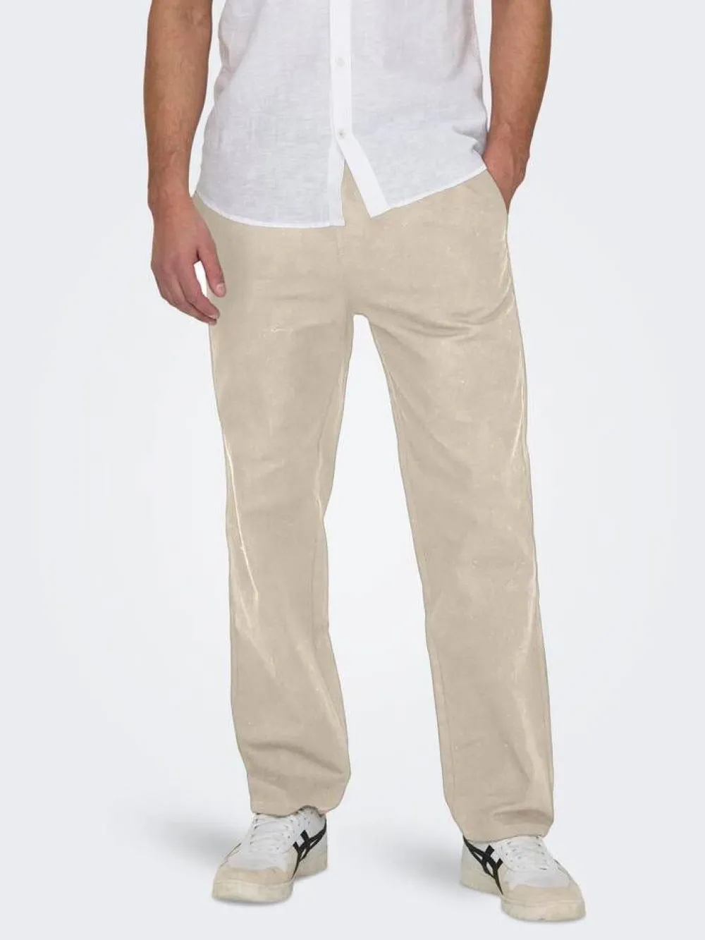 Puuvilla-pellavasekoitteiset kangashousut väljällä istuvuudella. Vyötäröllä solmittava nyöri ja sivusaumoissa ti…