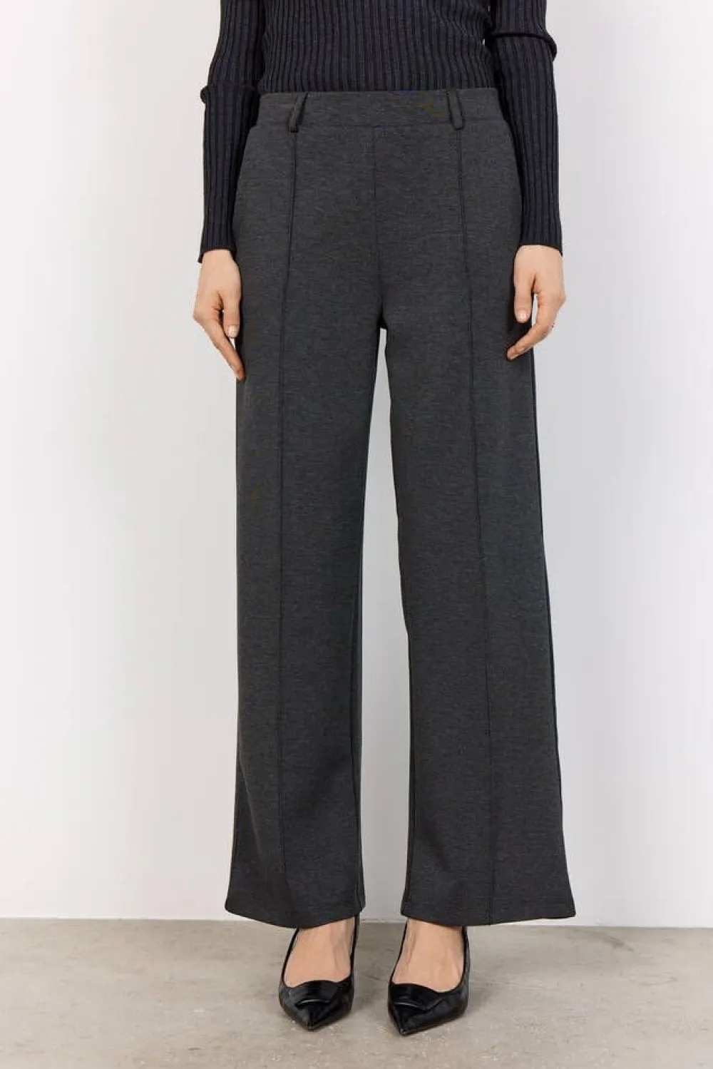 Siistit leveälahkeiset housut paksusta trikoosta, lahkeissa etusaumat. Sivuilla on taskut ja joustavalla vyötäröllä…