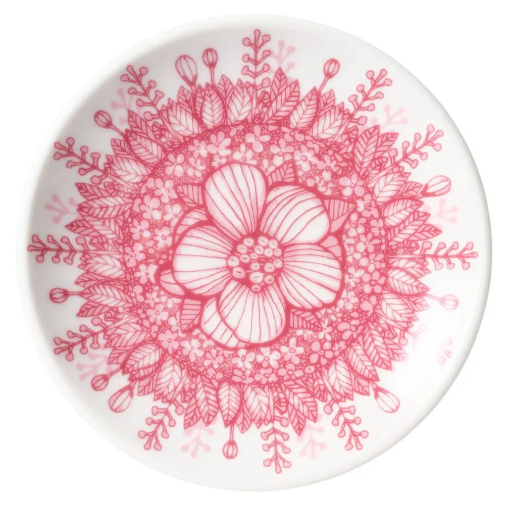 Huvila-lautasen pinnalla kukkivat herkät vaaleanpunaiset käsin piirretyt villiruusut. Heini Riitahuhdan suunnittelema …