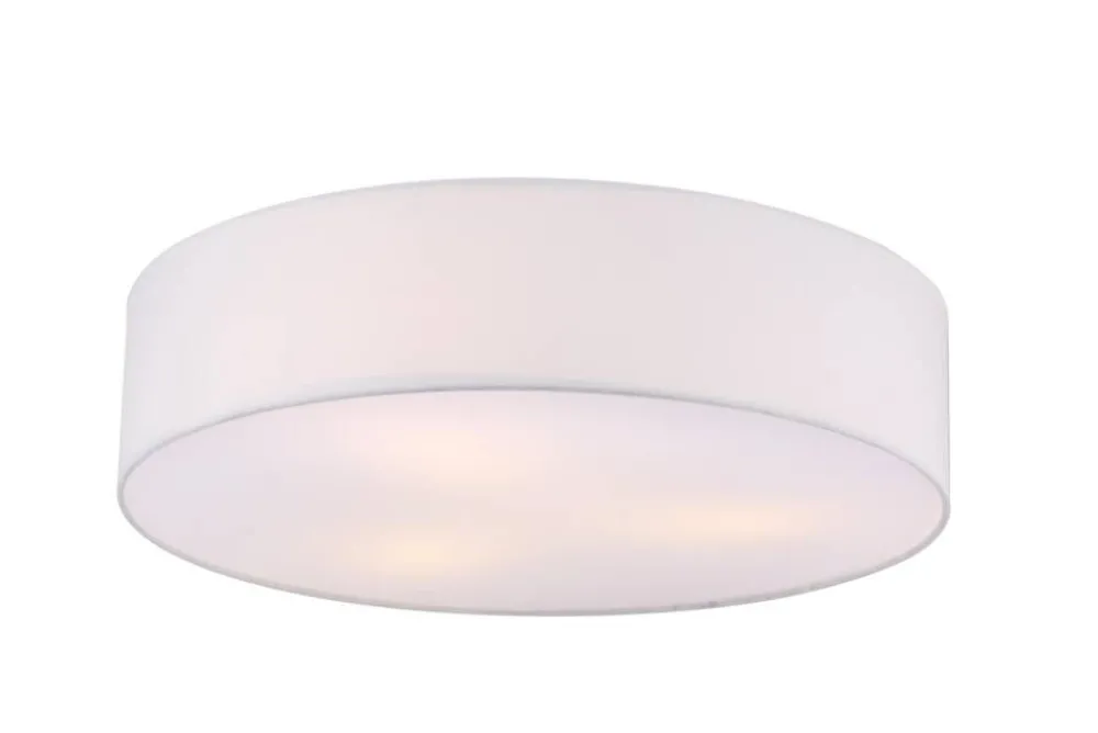Tyylikäs suuri plafondi valkoisella kangasvarjostimella. Varjostimen kiinnitys magneeteilla. Kiinteä rasia-asennus.L…