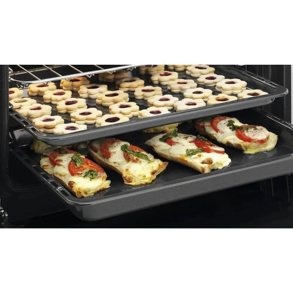 | Varustelu: kromattu ritilä, emaloitu uunipannu ja kaksi emaloitua leivinpeltiä. Mukana yhdet teleskooppikannattimet |