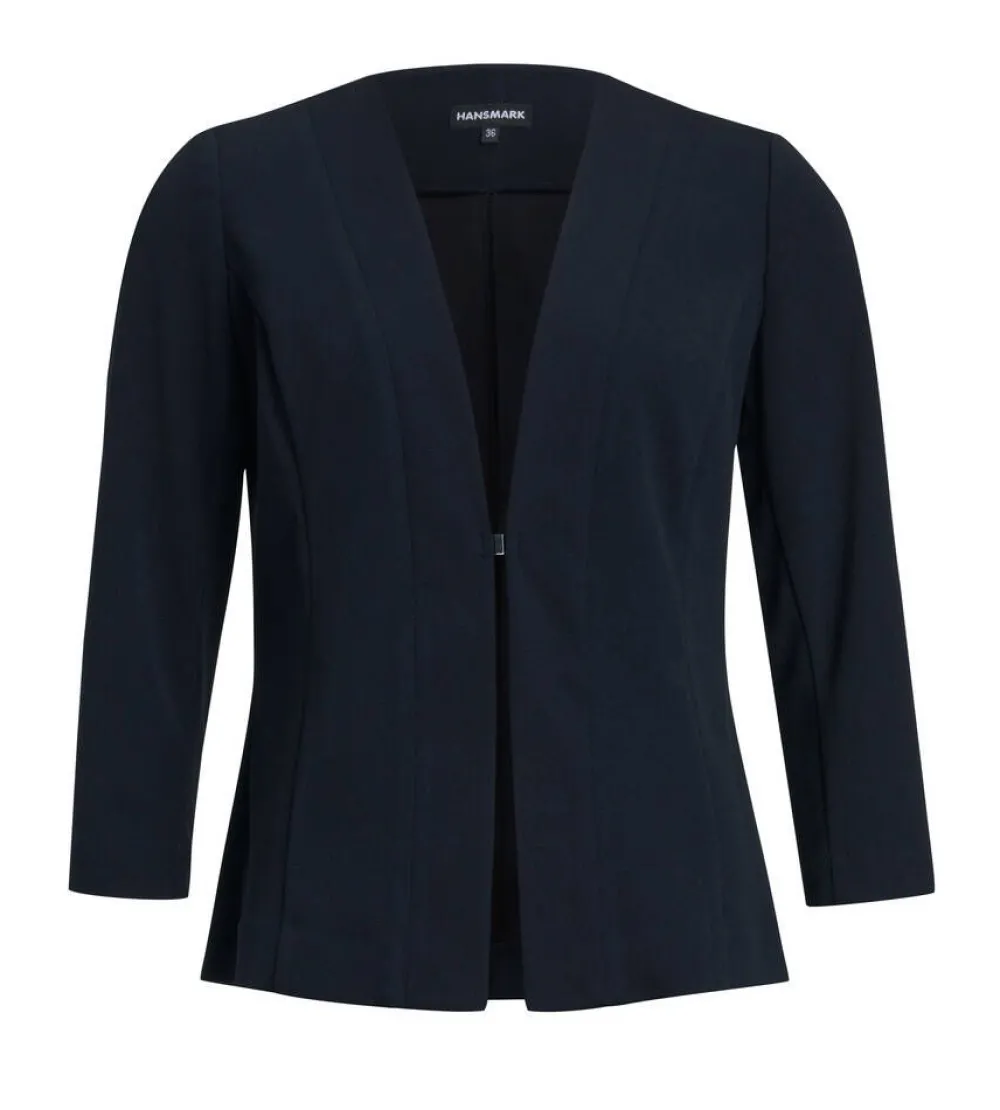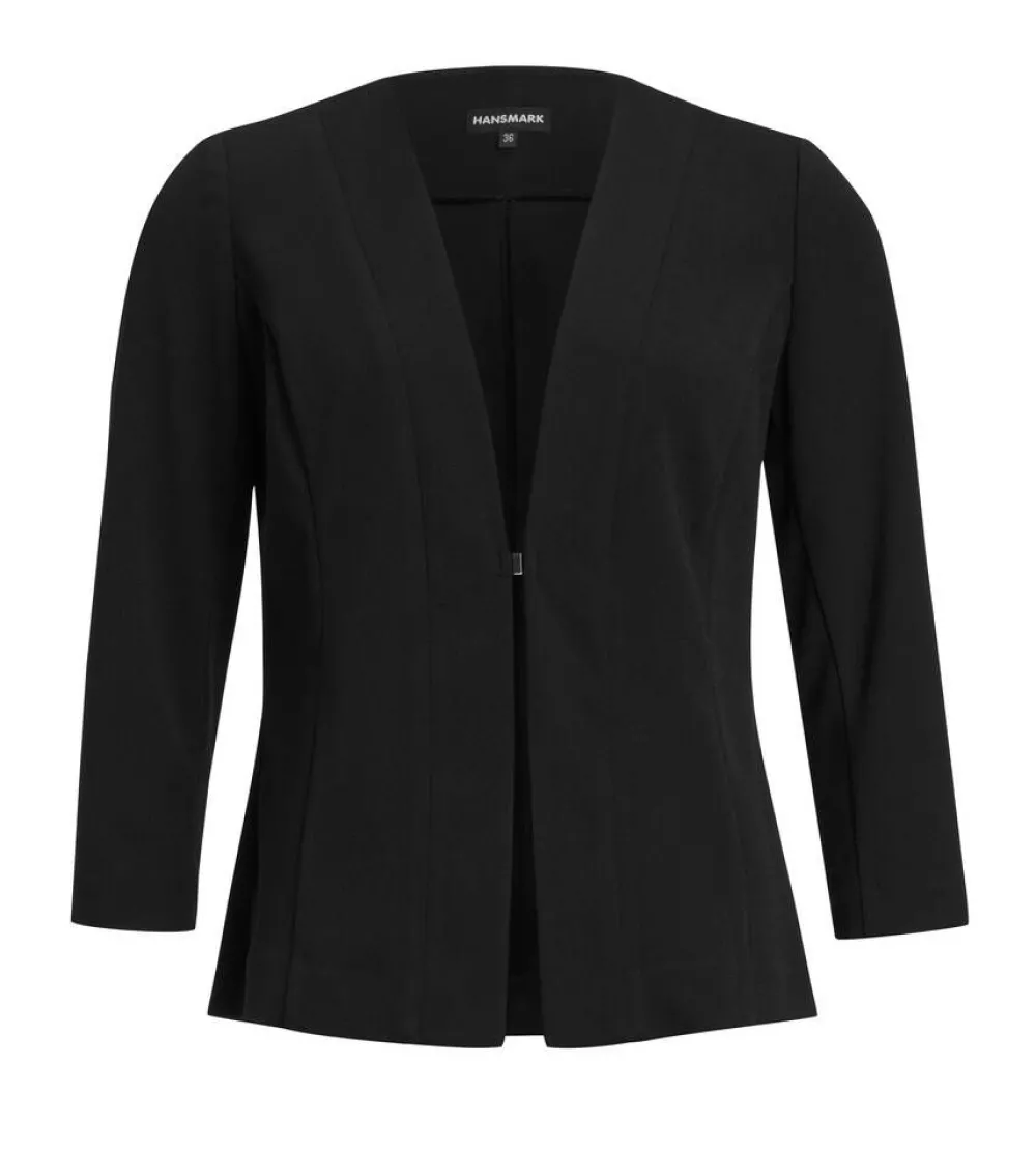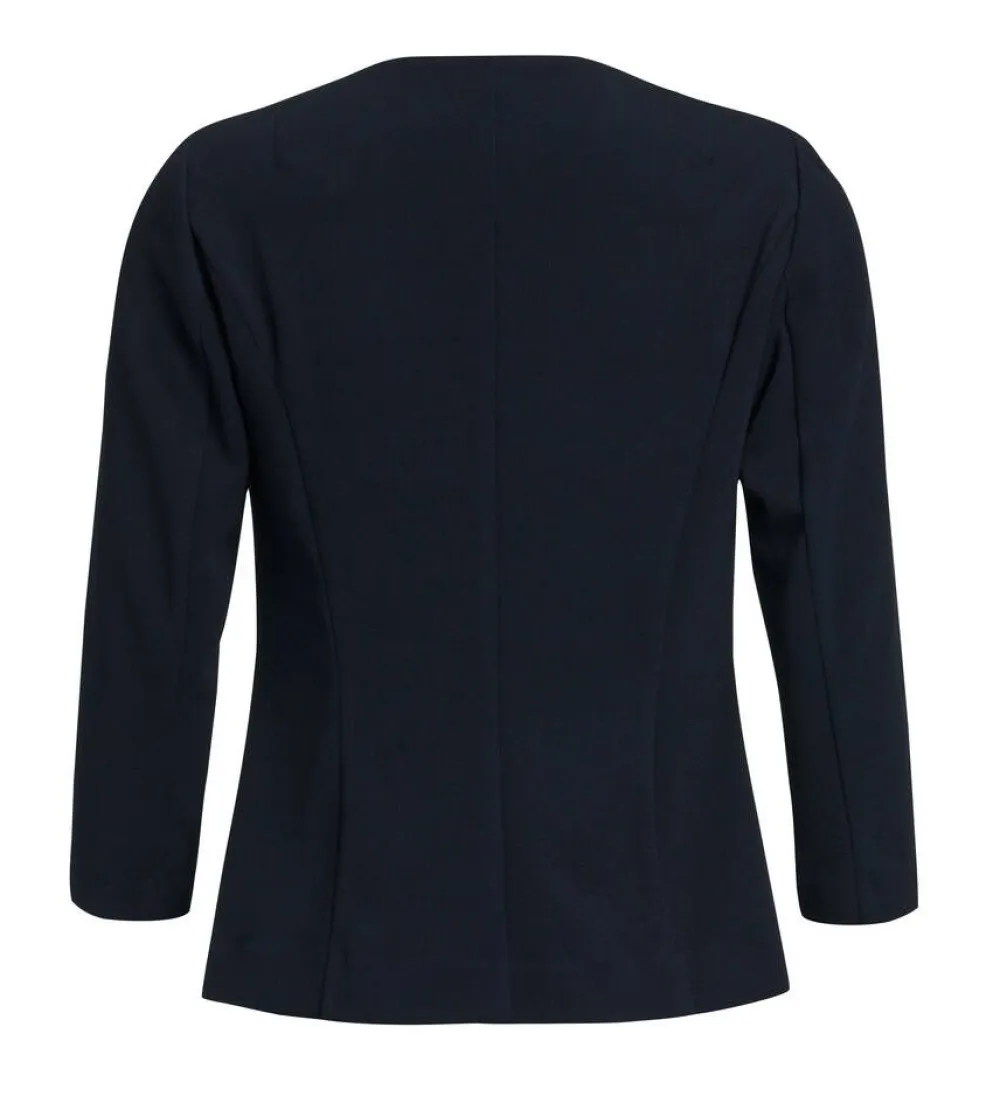Joustava jakku vajaamittaisilla hihoilla ja pienillä olkatoppauksilla. Yksivärisen jakun etupuolella on helppo magneet…