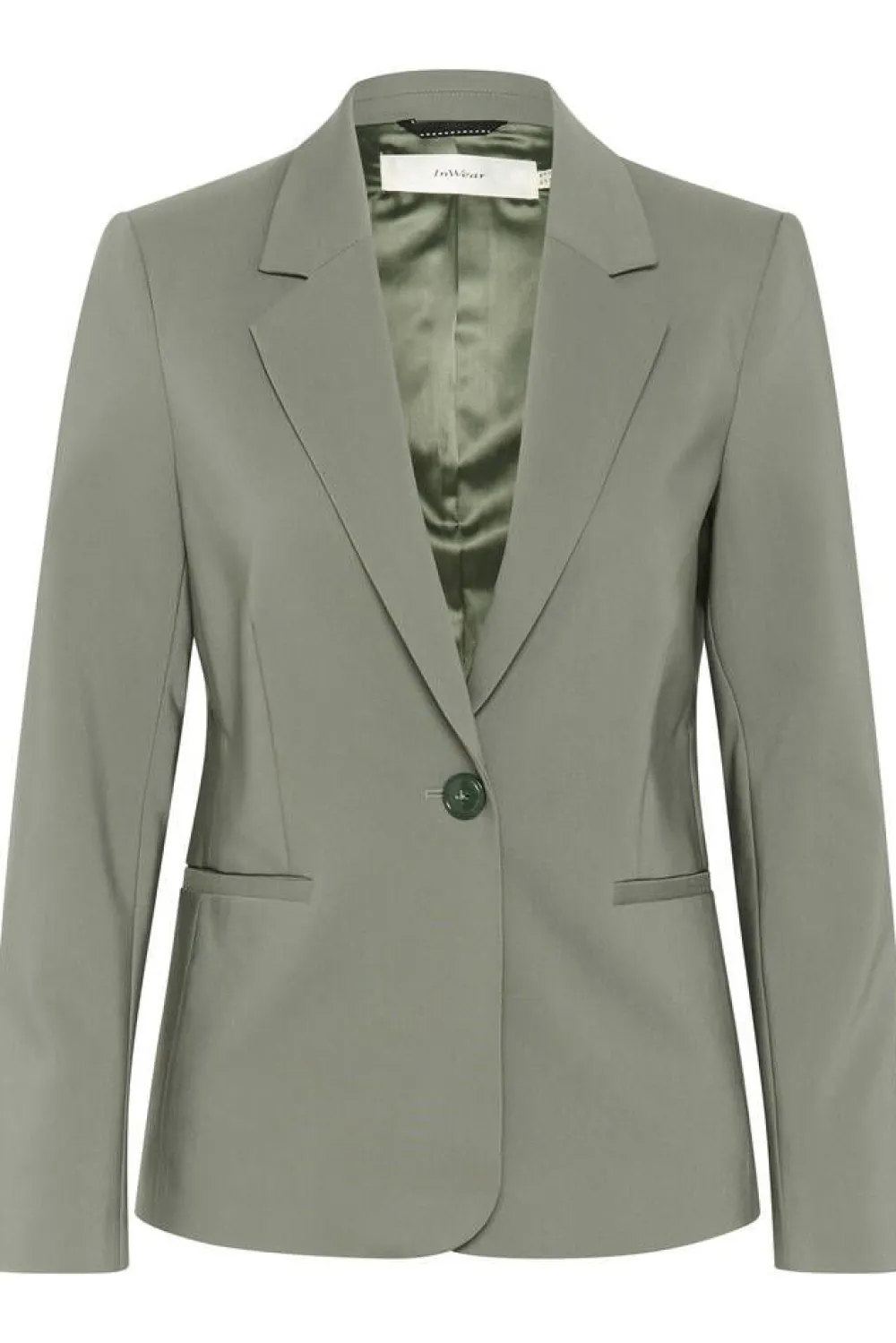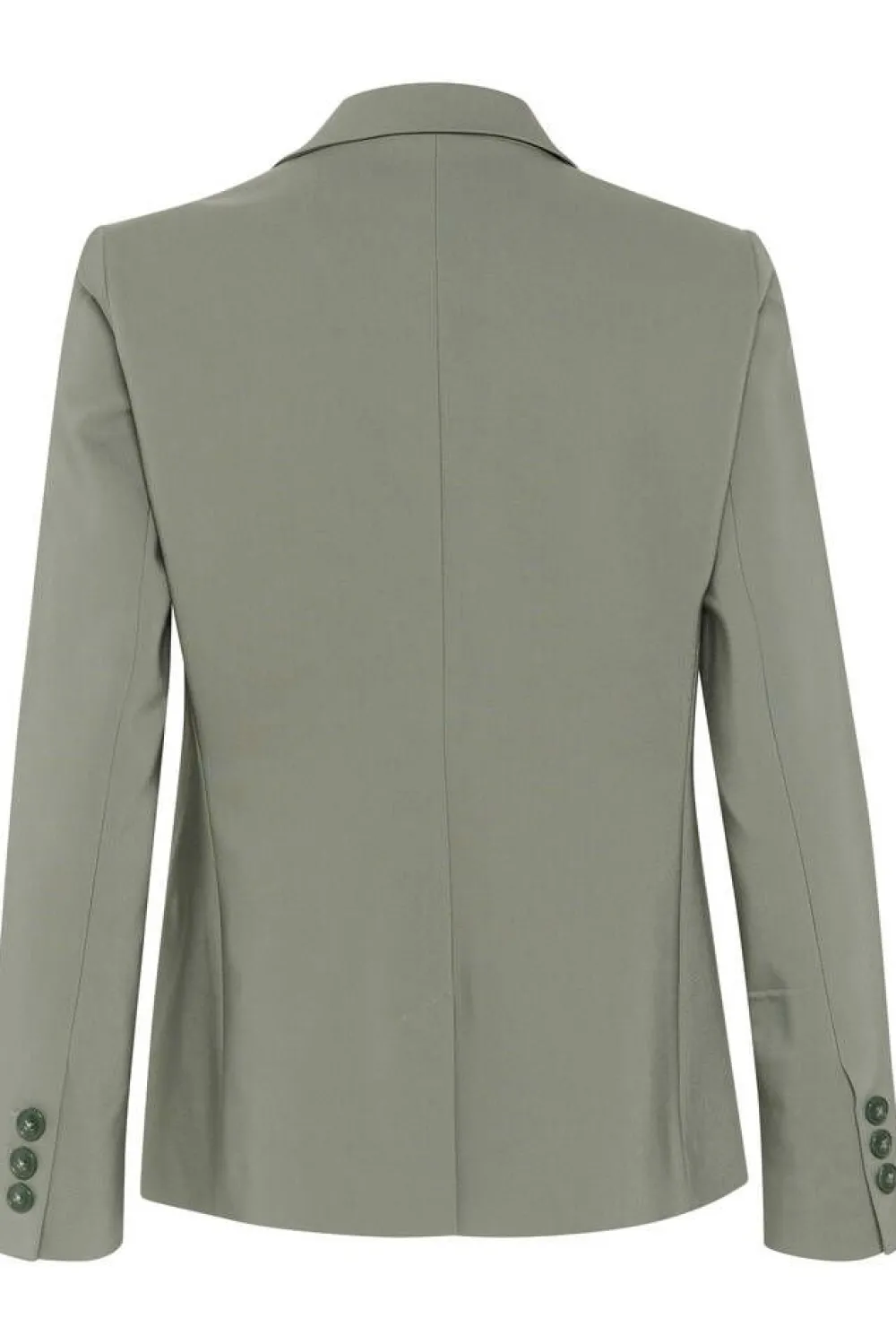 Trendikäs ja naisellinen jakku klassisen tyylikkäillä herrainkauluksilla ja napinläpitaskuilla. Edessä on yksi napp…
