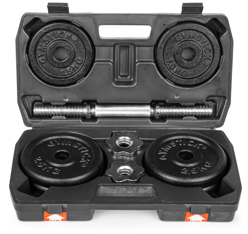 | Sisältää: 2 x Käsipainotangot (halkaisija 25 mm). 4 x Teräksiset kierrelukot. 4 x 2,5 & 4 x 1,25 kg valuratalevypainot. Muovinen kantolaukku |